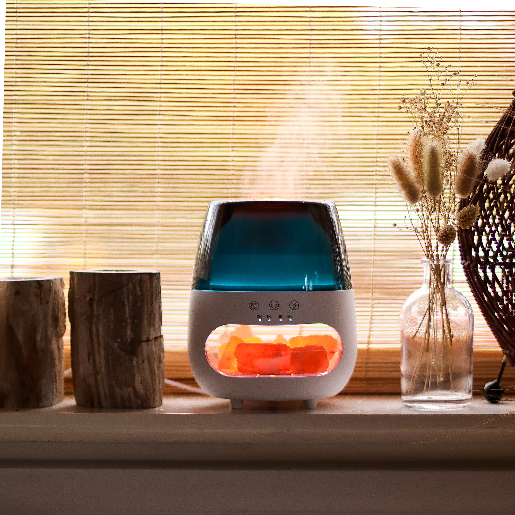 De Zoutsteen Vlam-Effect Aromadiffuser combineert een elegant design met geavanceerde wellnesstechnologie en bevat Himalayazout dat de aromatherapie-ervaring verrijkt met zijn natuurlijke, luchtzuiverende eigenschappen.
