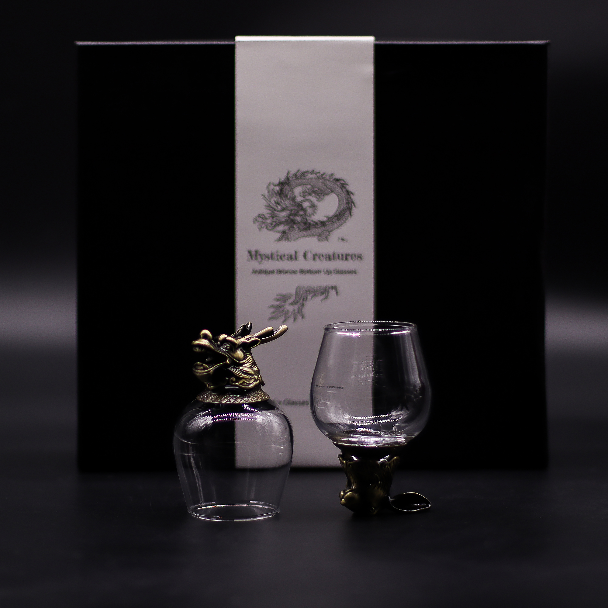 Elk glas heeft een zware messing basis, gevormd tot mythische figuren zoals de draak, cobra, tijger, olifant, geit en ram – prachtig gedetailleerd en vol karakter. Wanneer het glas wordt omgedraaid, komt het figuur volledig tot leven, waardoor elk stuk een klein kunstwerk op zich is.