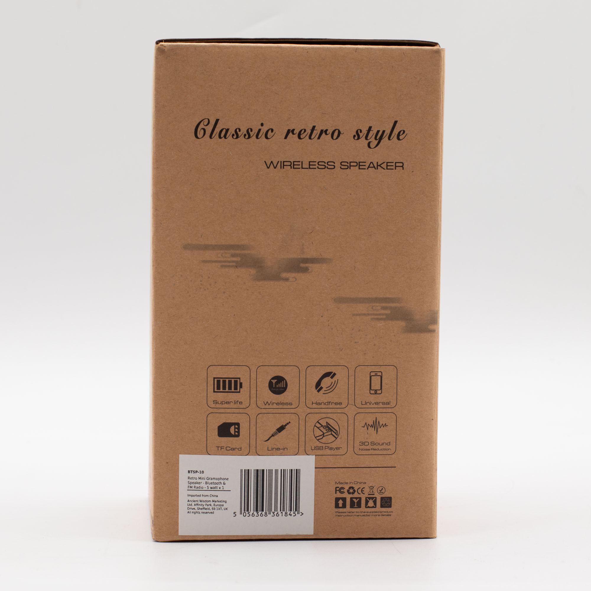 Met een vermogen van 5 watt x 1 levert hij helder en gebalanceerd geluid, perfect voor persoonlijke luisterplekken. Geleverd met een USB-oplaadkabel en audiokabel, is dit een cadeauklaar, direct te presenteren accessoire dat nostalgisch design combineert met betrouwbare prestaties.