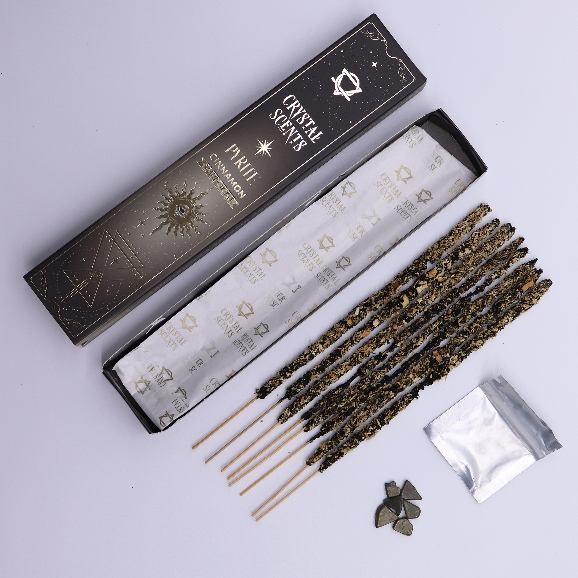 Elke verpakking bevat 10 handgemaakte smudgestokjes en een echte Pyriet kristal, waardoor het een uitstekend product is voor ritueelkits, overvloed-georiënteerde displays of winkels met een focus op persoonlijke groei. De combinatie van geur en kristal stimuleert dagelijkse intentiestellingen en kleine motiverende rituelen.