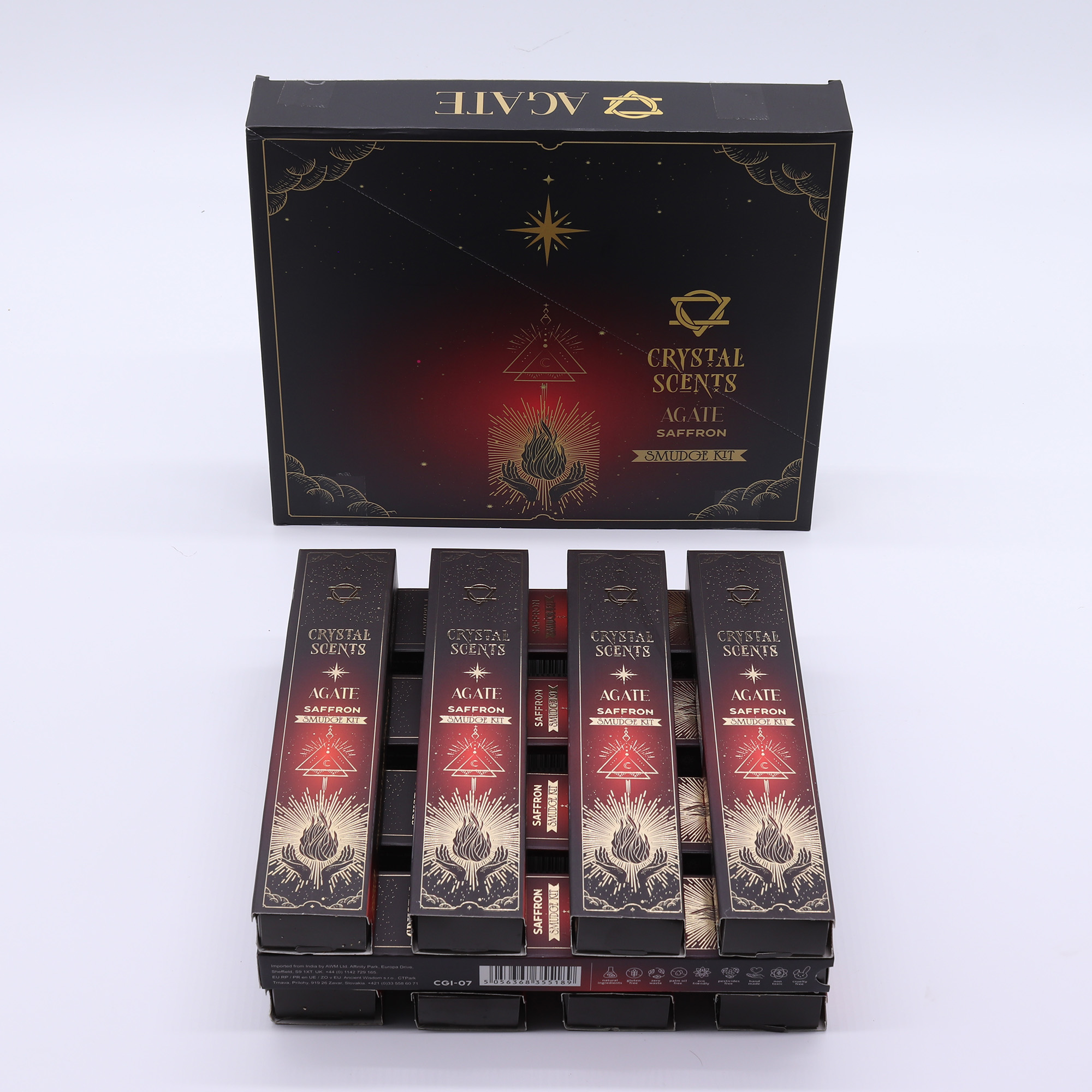 Elke verpakking bevat 10 handgemaakte smudgestokjes met een echte Rode Agaat kristal, waardoor het sterk geschikt is als cadeau en een brede retail aantrekkingskracht heeft. De warme, rijke geur maakt het geschikt voor zowel dagelijkse centreringsrituelen als seizoensdisplays.