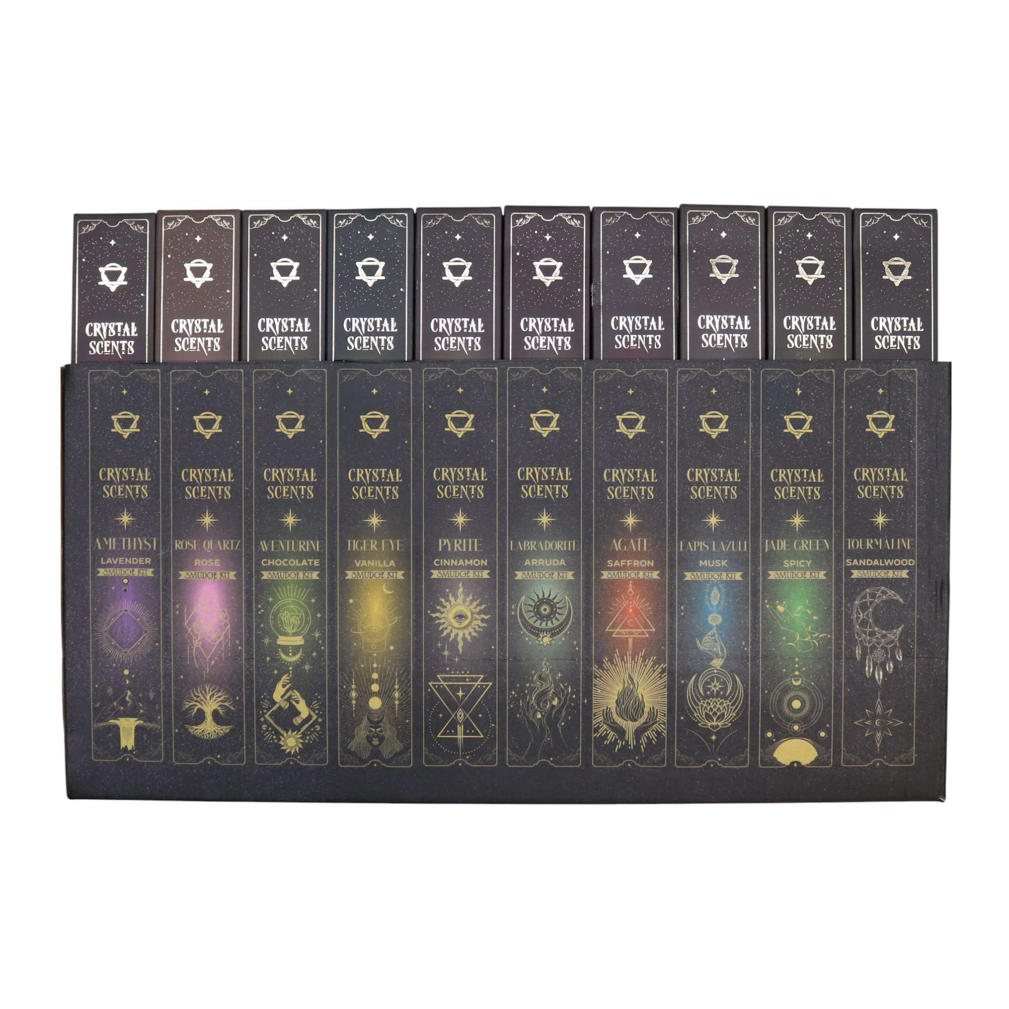 Ontdek de volledige magie van onze Crystal Scents Smudge Wierook collectie met deze complete starterset. Elke set bevat 60 verkoopklare verpakkingen — 6 verpakkingen van elk van onze 10 signature geuren — en biedt een verscheidenheid aan aroma’s en kristalenergieën die passen bij elke intentie en ruimte.