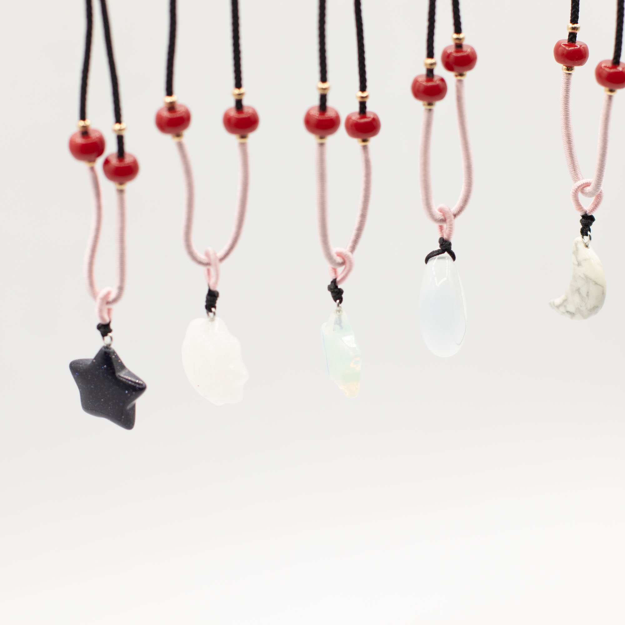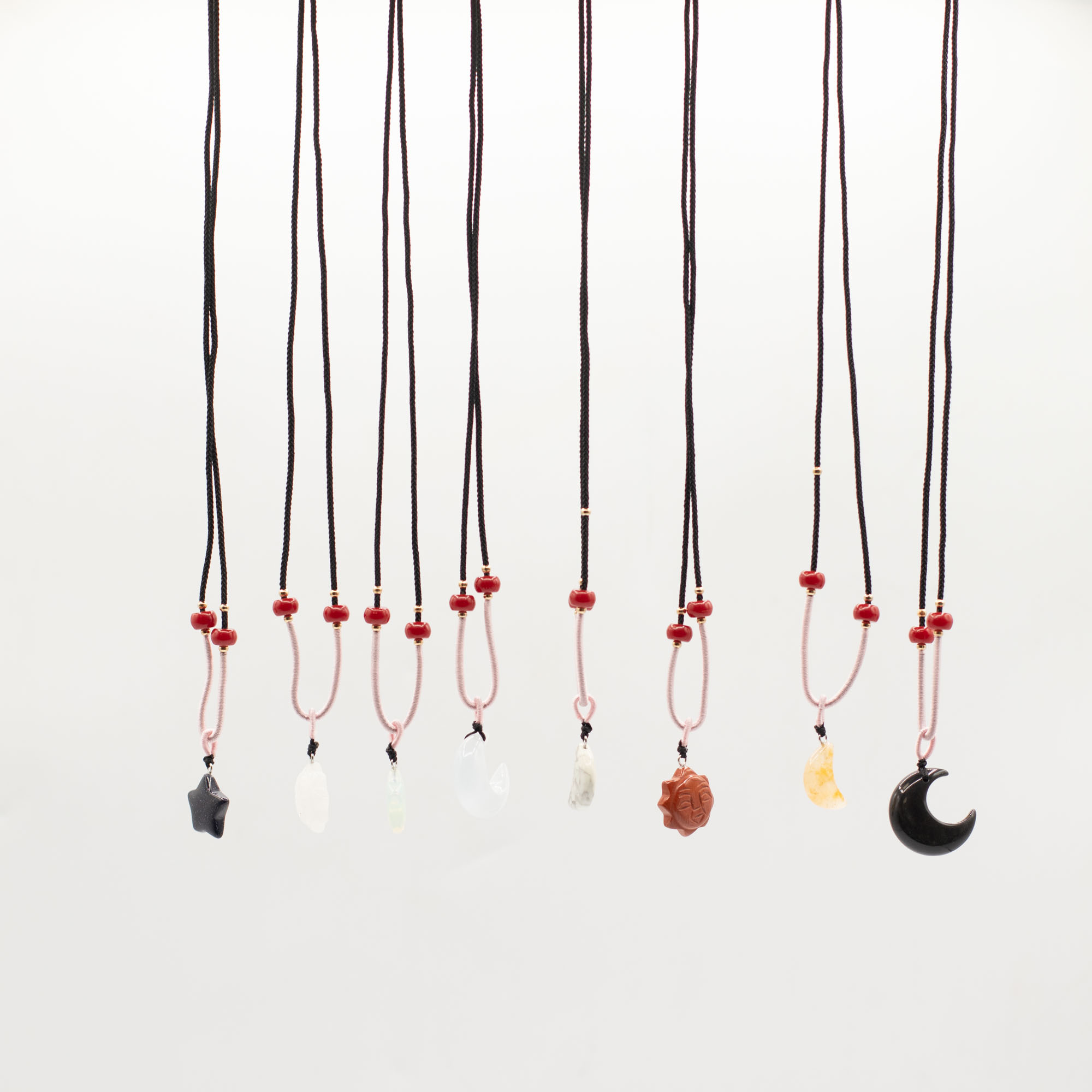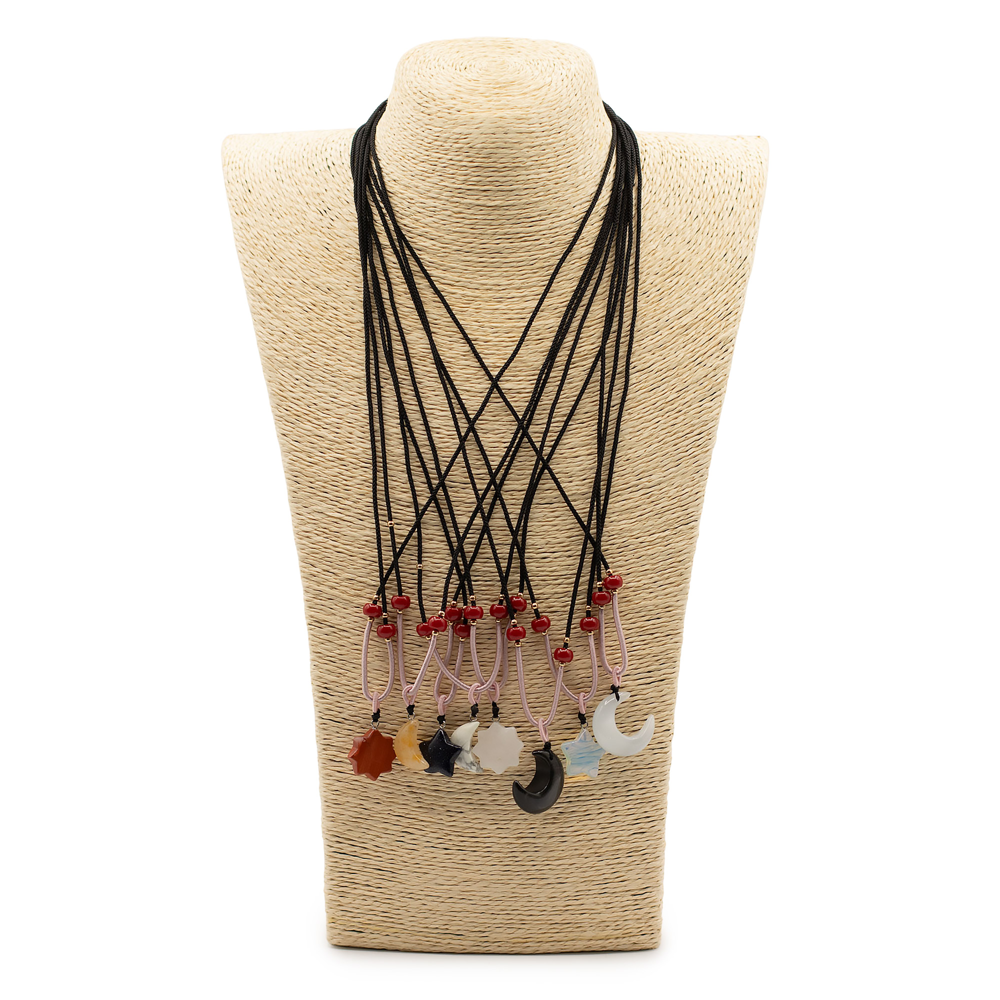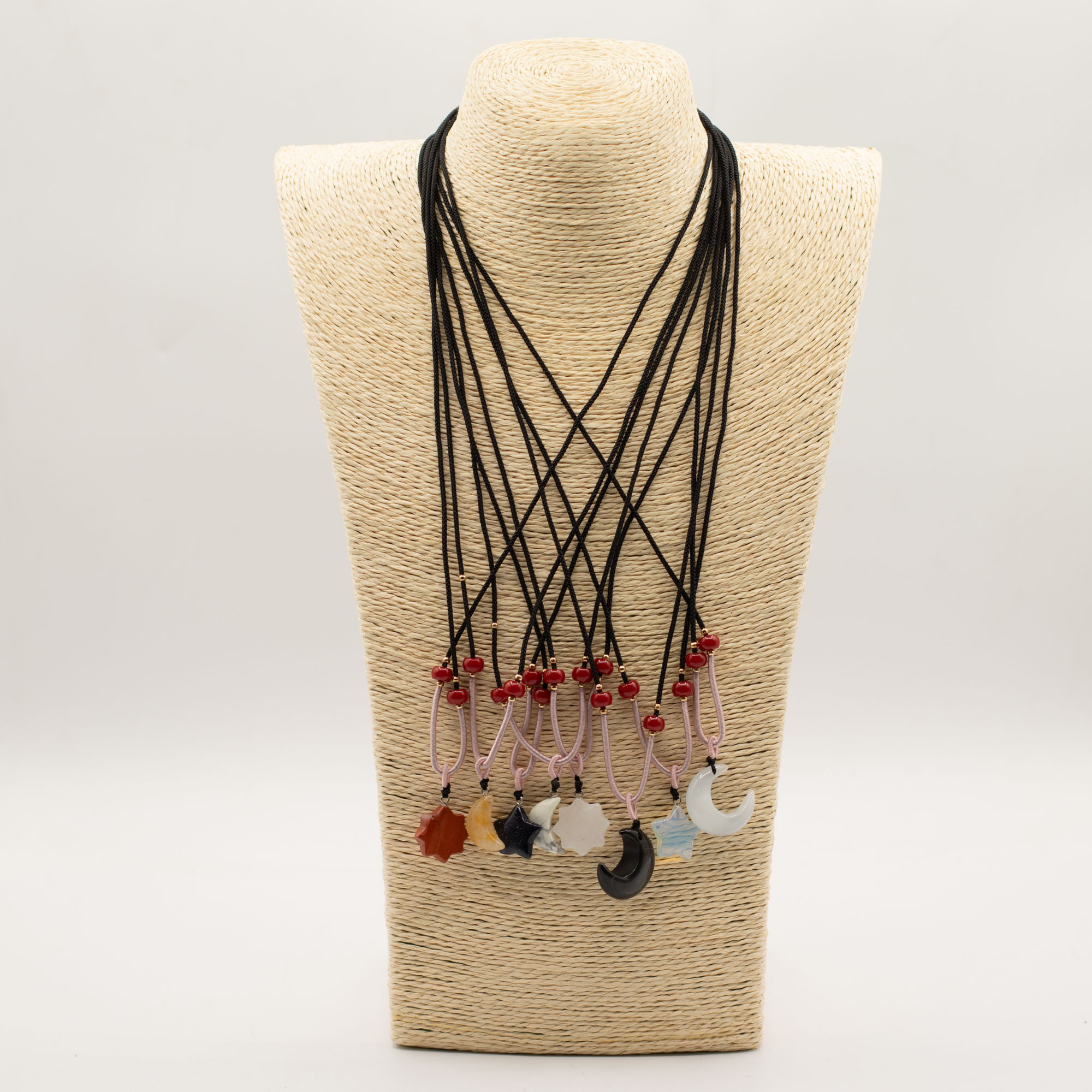 Elke hanger is bevestigd aan een verstelbaar koord en afgewerkt met subtiele kraaldetails, wat zorgt voor een ambachtelijke uitstraling die direct klaar is voor presentatie in de winkel.