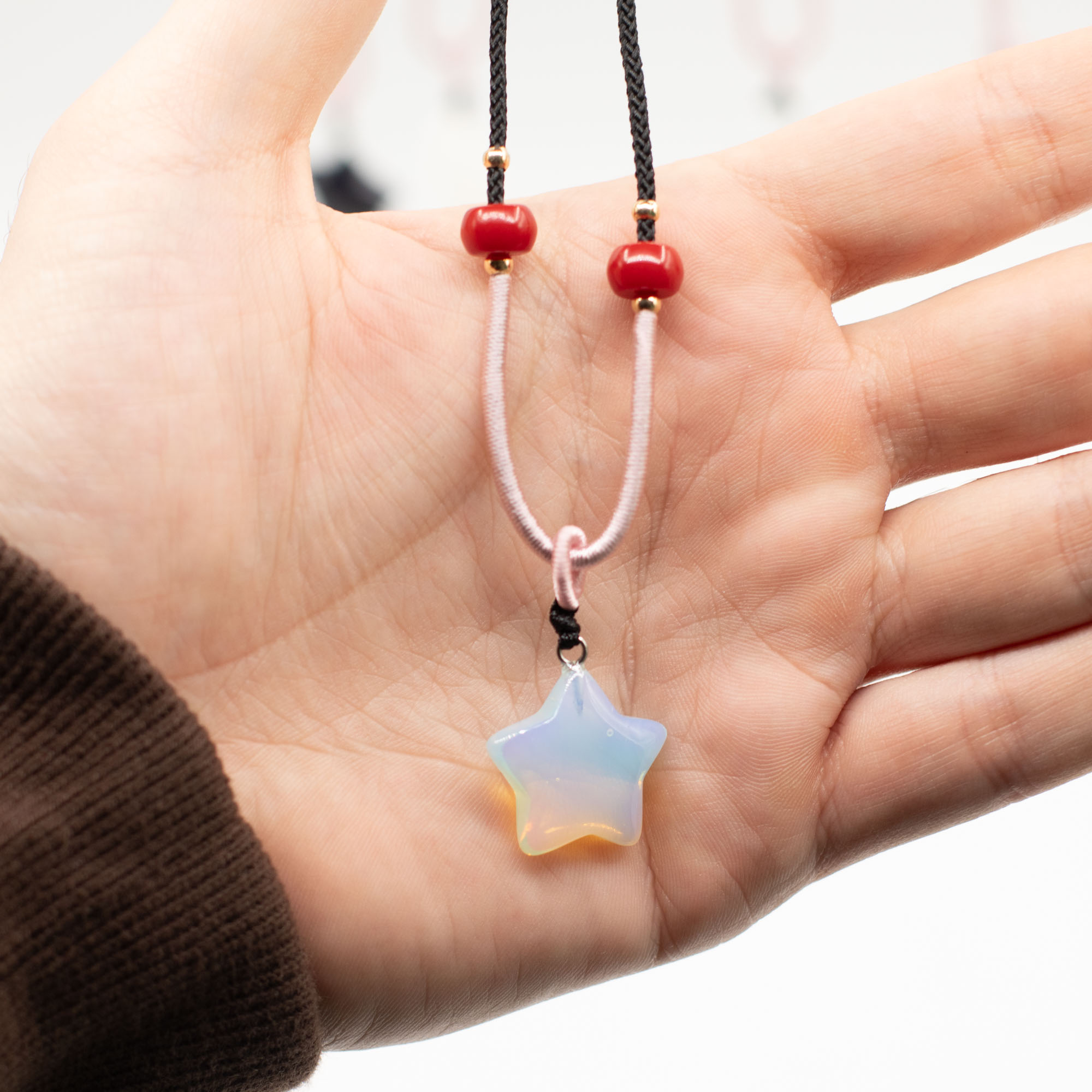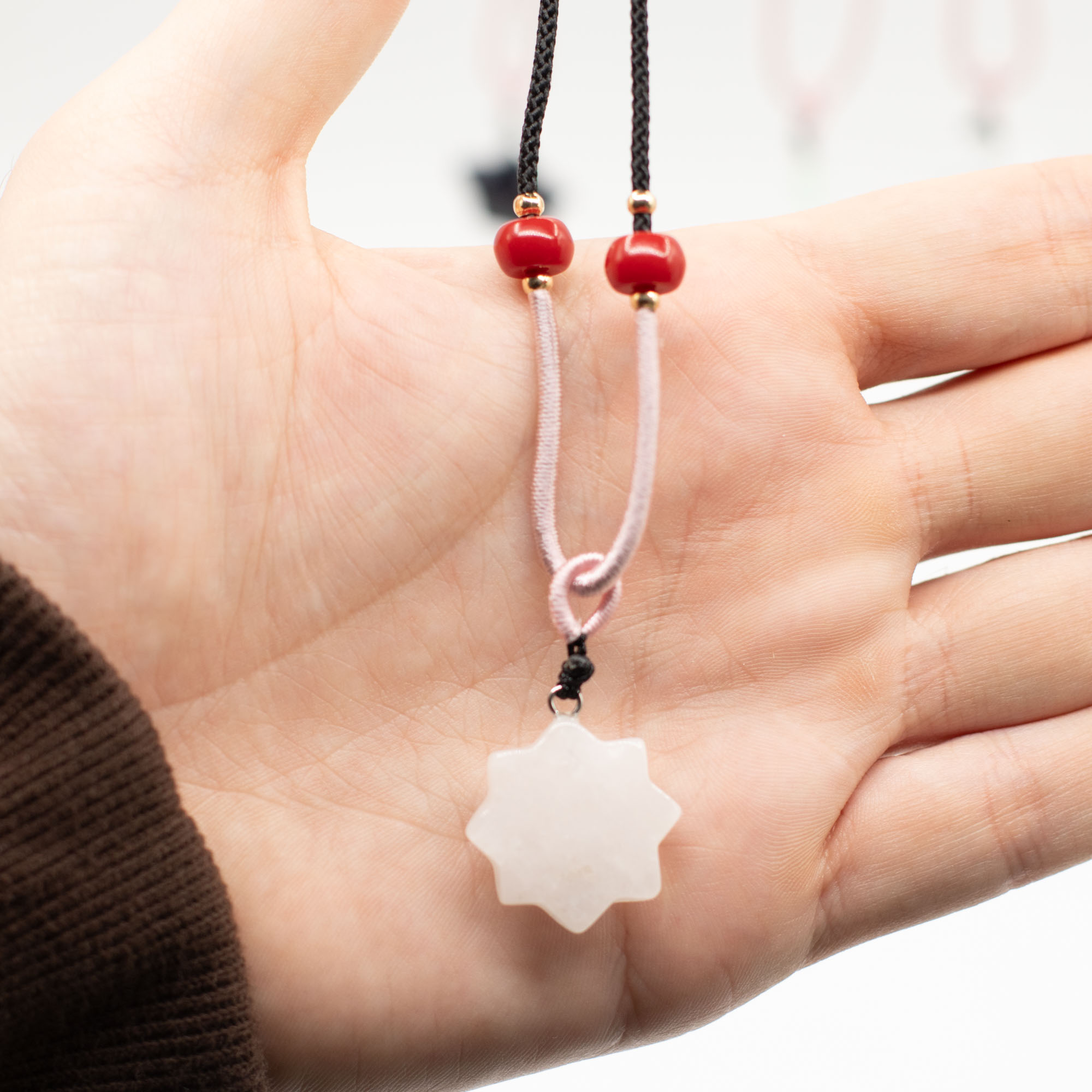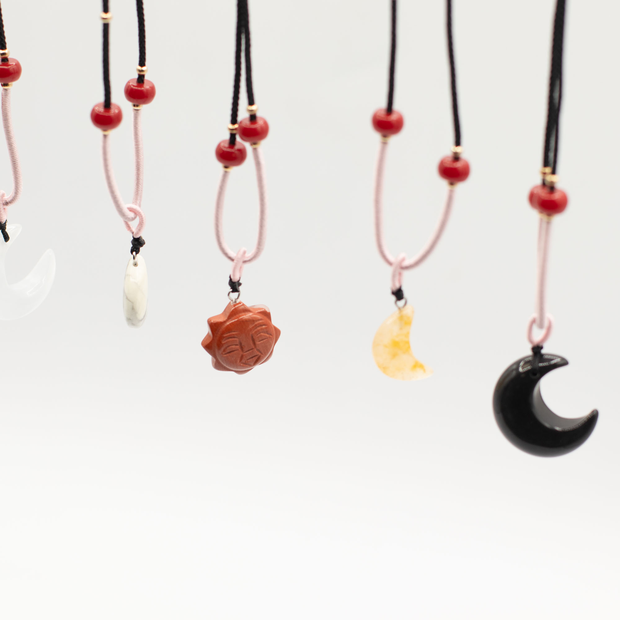 Elke hanger is bevestigd aan een verstelbaar koord en afgewerkt met subtiele kraaldetails, wat zorgt voor een ambachtelijke uitstraling die direct klaar is voor presentatie in de winkel.