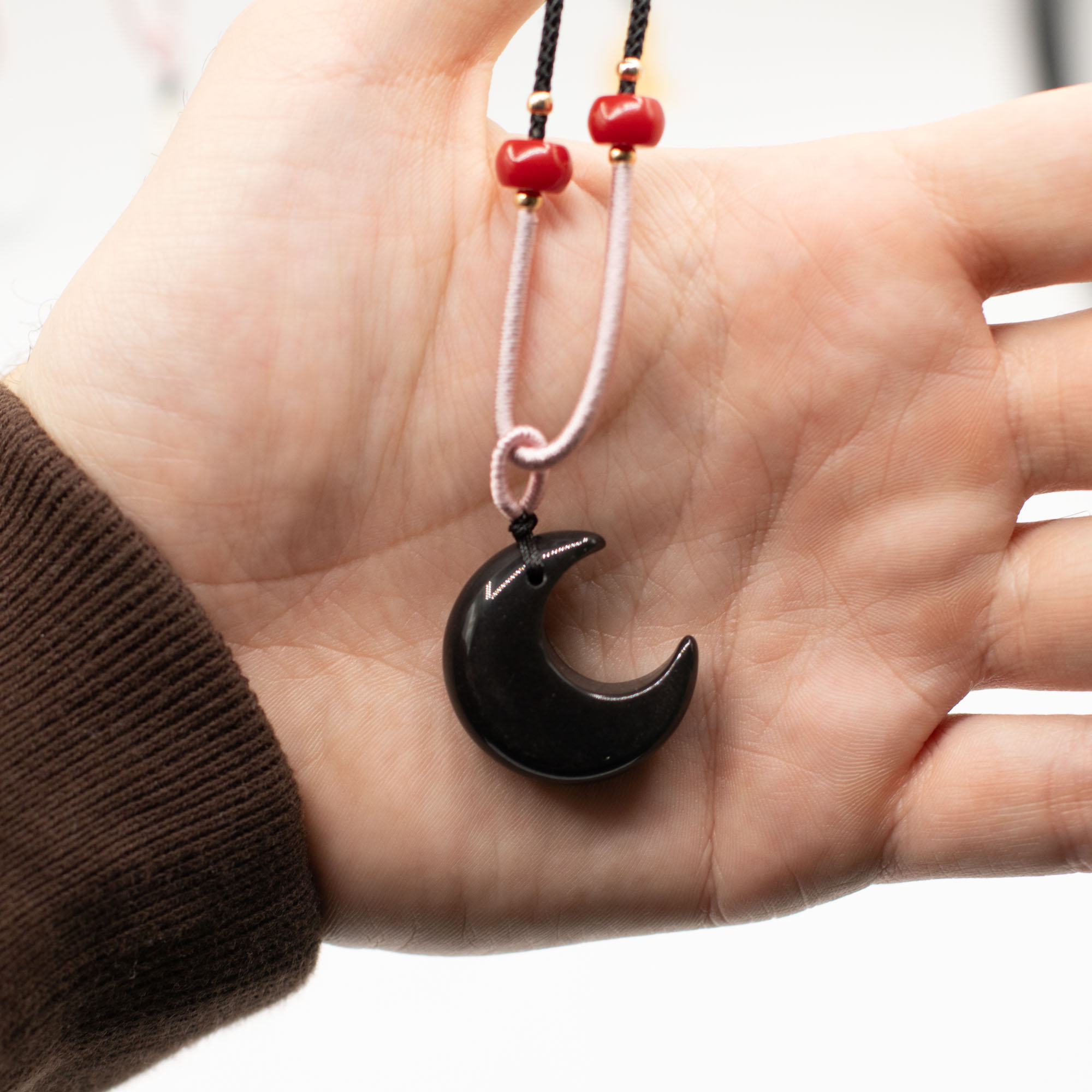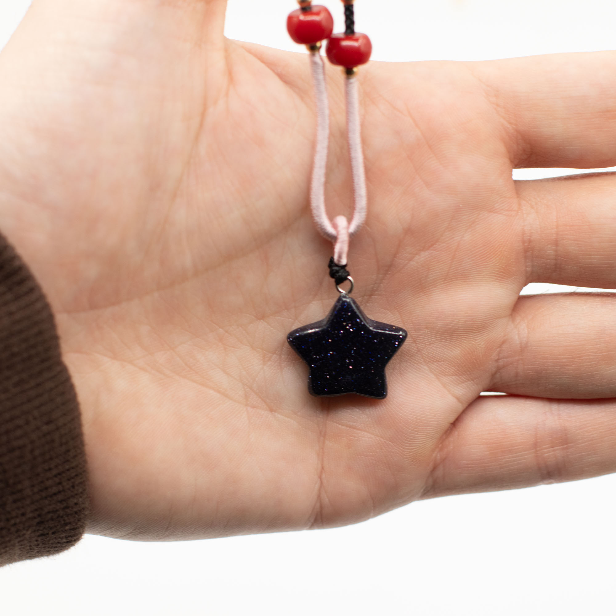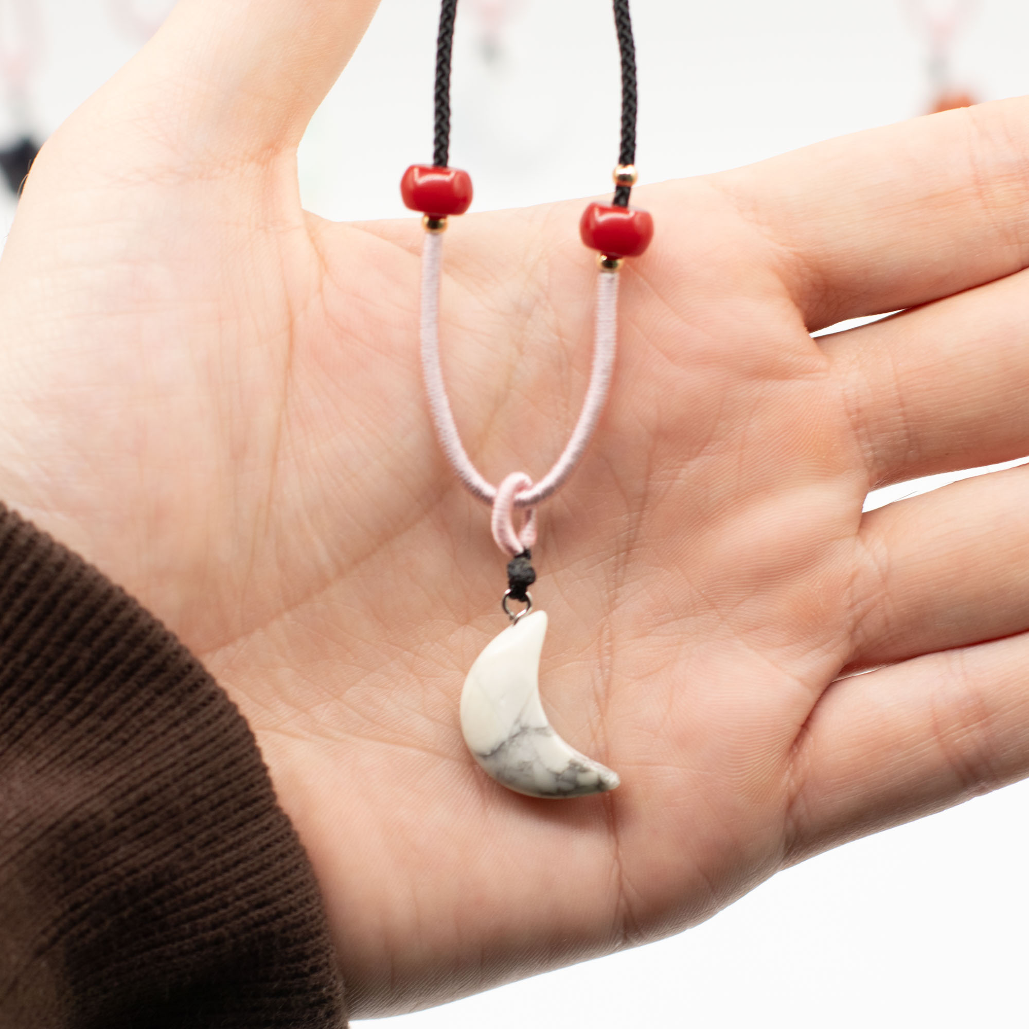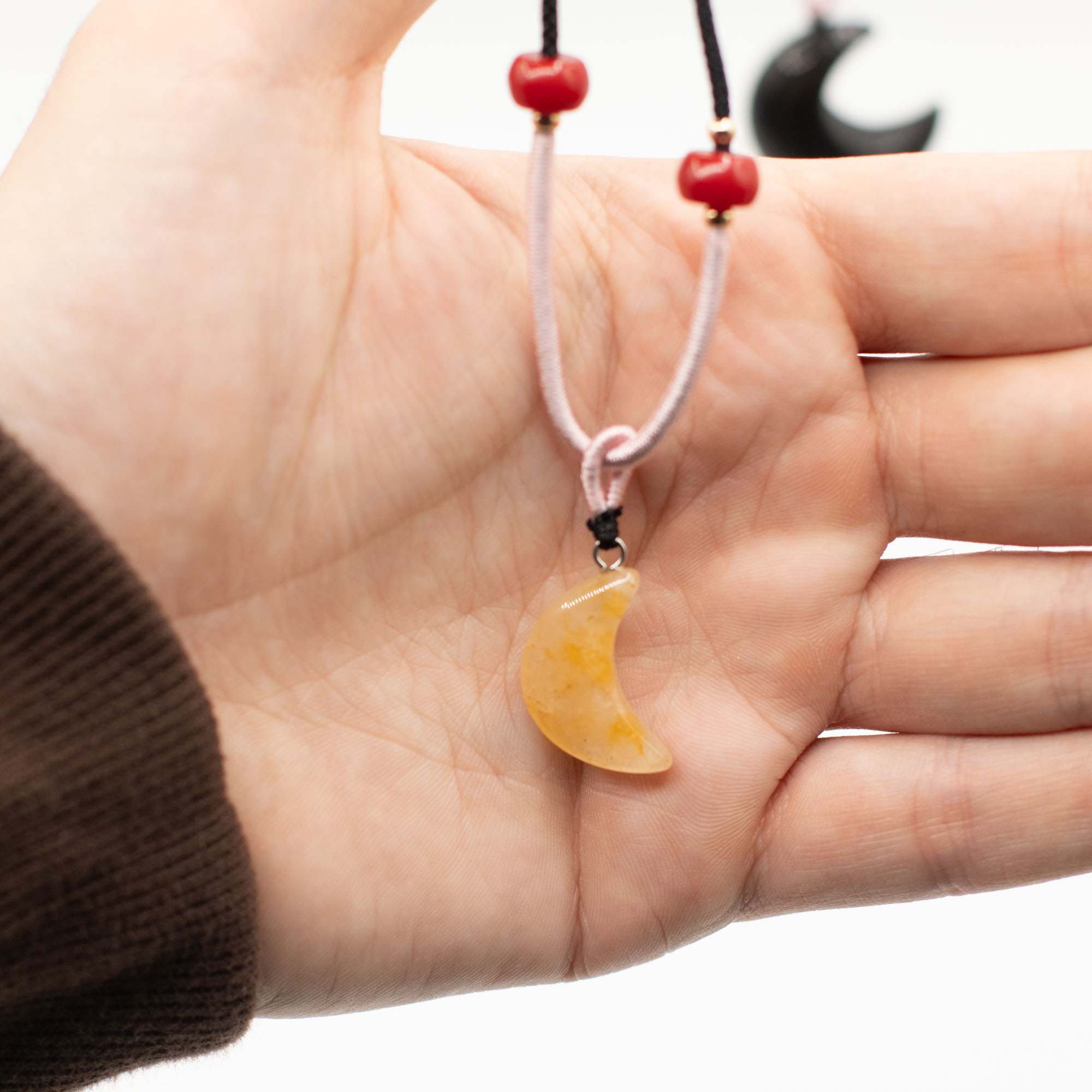 Elke hanger is bevestigd aan een verstelbaar koord en afgewerkt met subtiele kraaldetails, wat zorgt voor een ambachtelijke uitstraling die direct klaar is voor presentatie in de winkel.