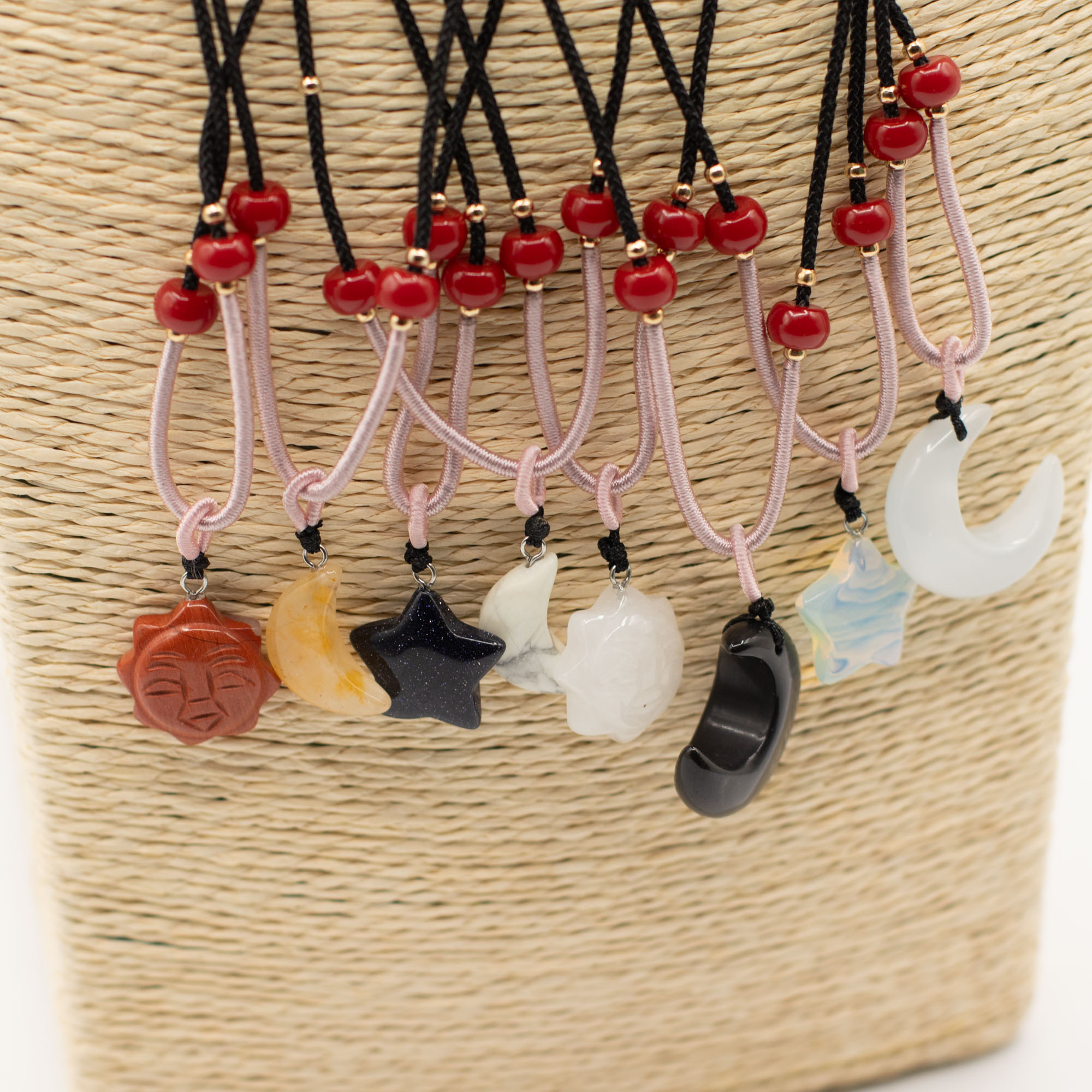 Het assortiment omvat populaire kosmische motieven, waaronder zonnen, manen en sterren, elk gevormd uit natuurlijke edelstenen. Variaties in kleur en textuur zorgen ervoor dat elk stuk uniek aanvoelt, terwijl het geheel toch een samenhangend hemels thema behoudt.
