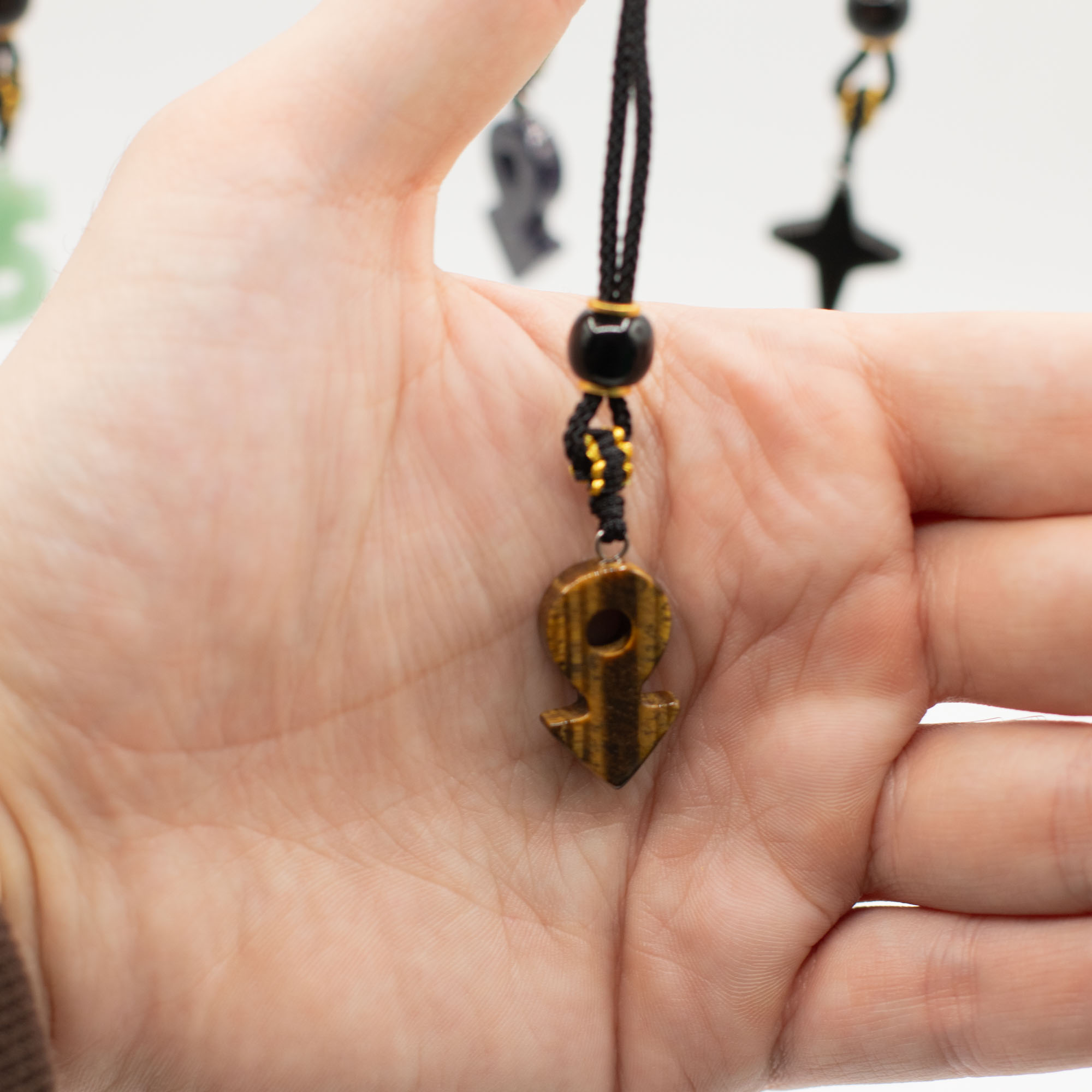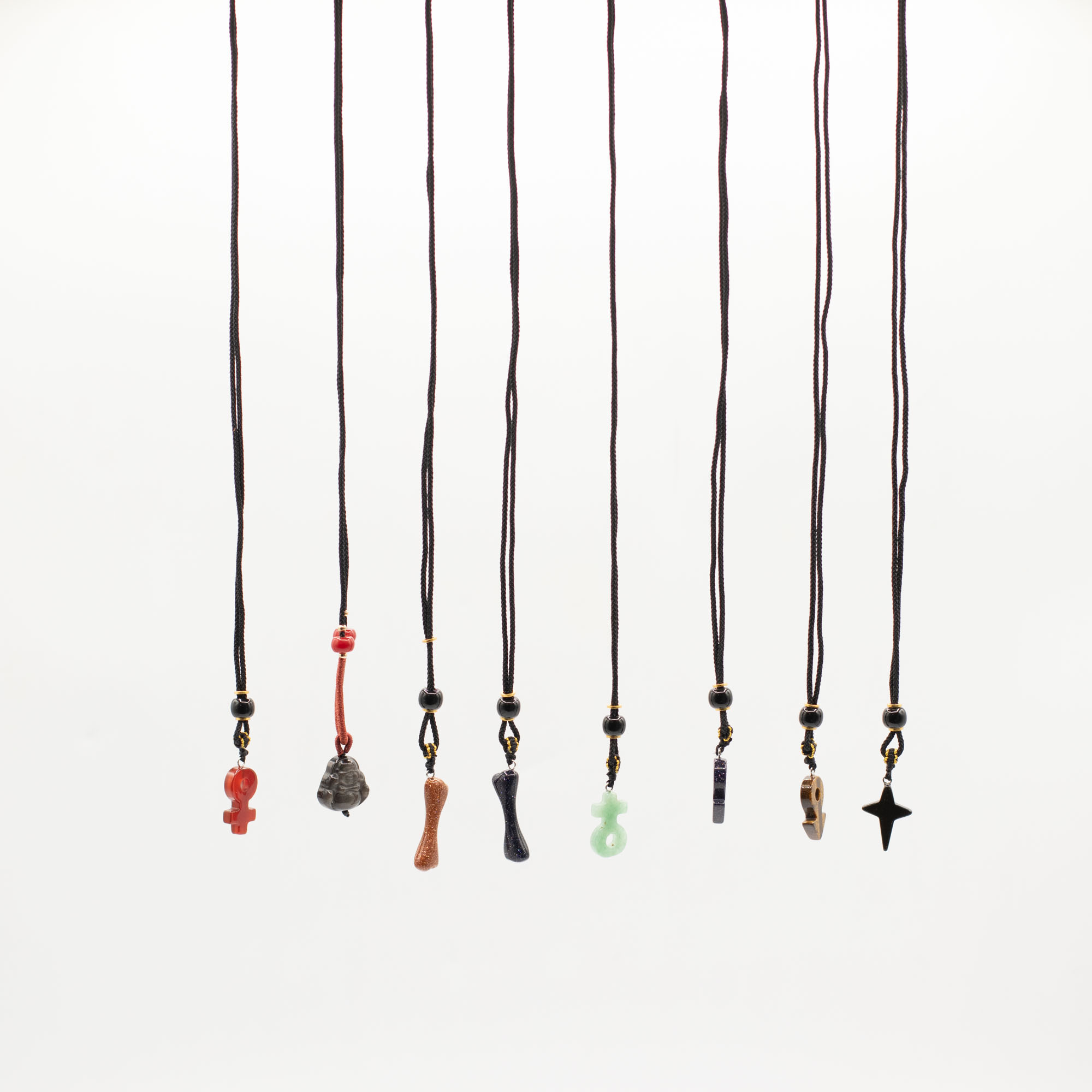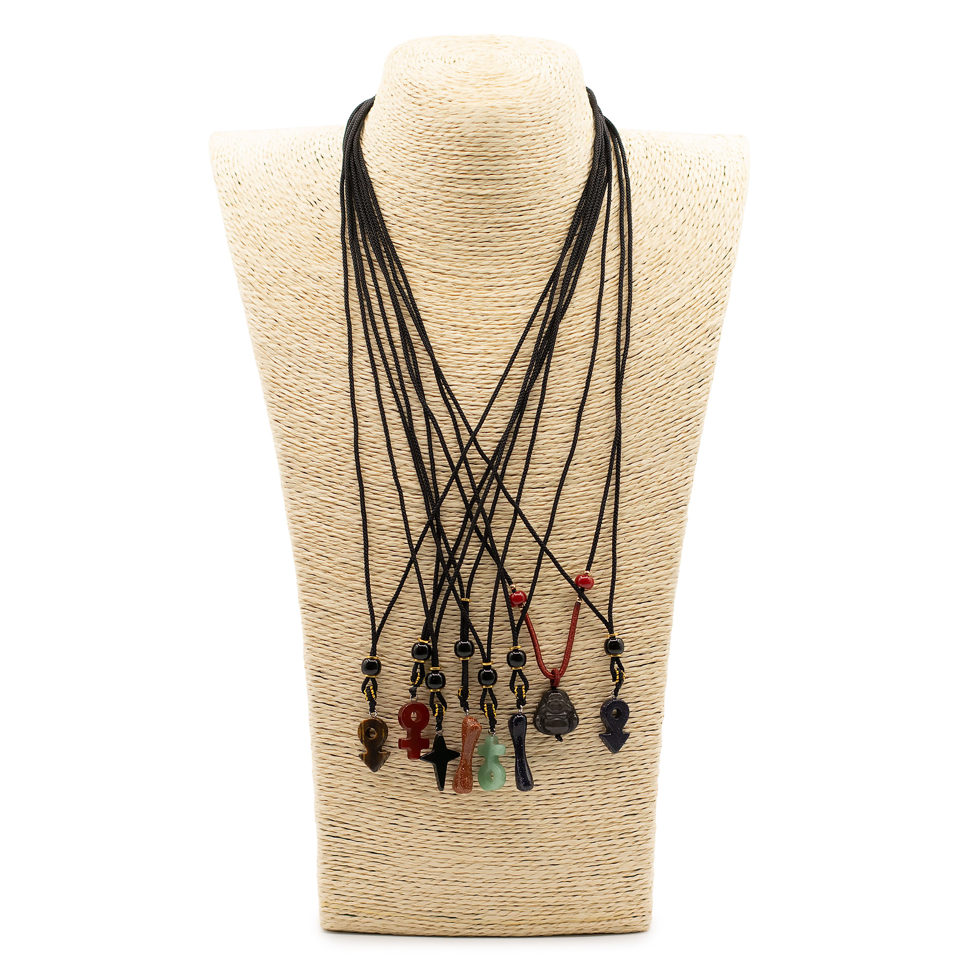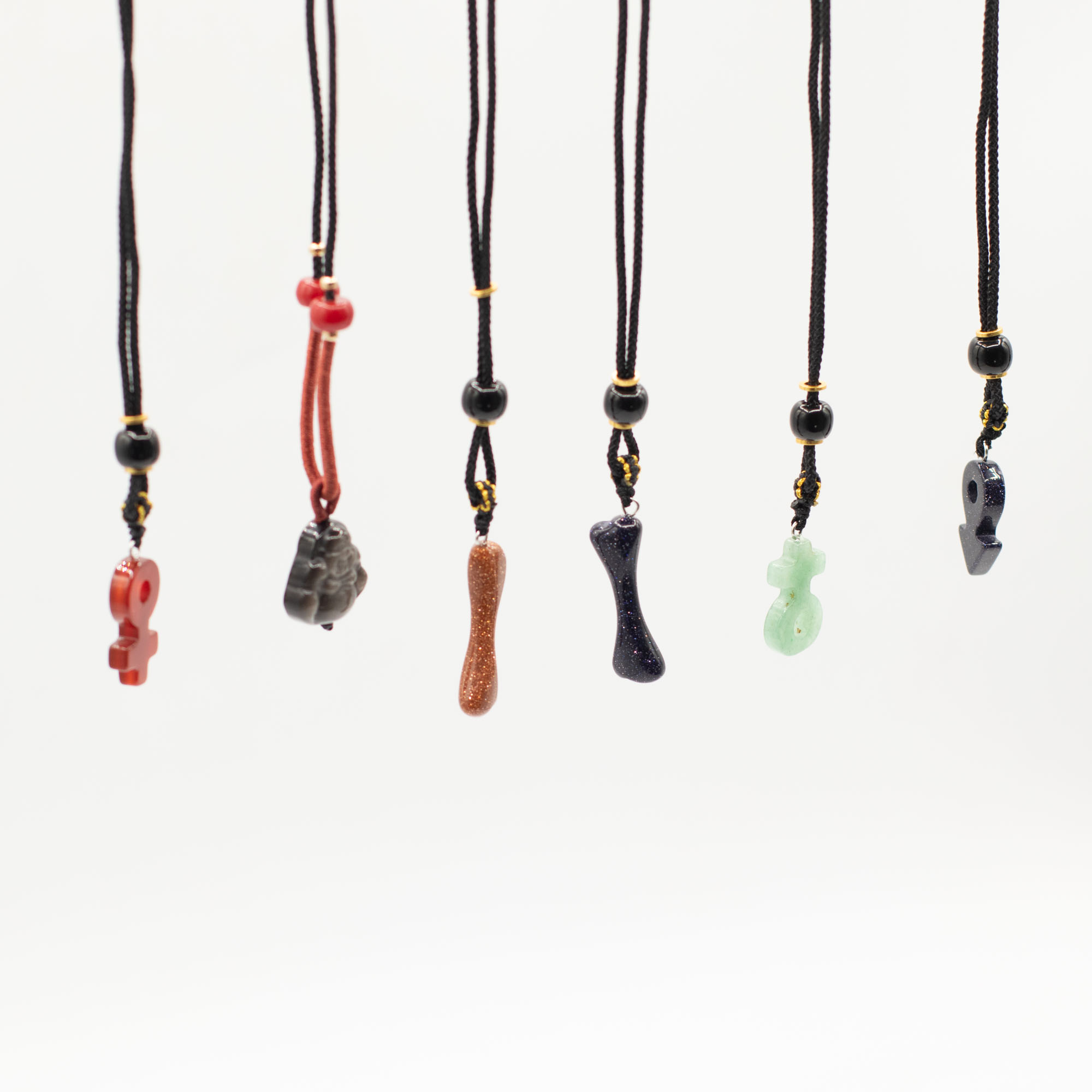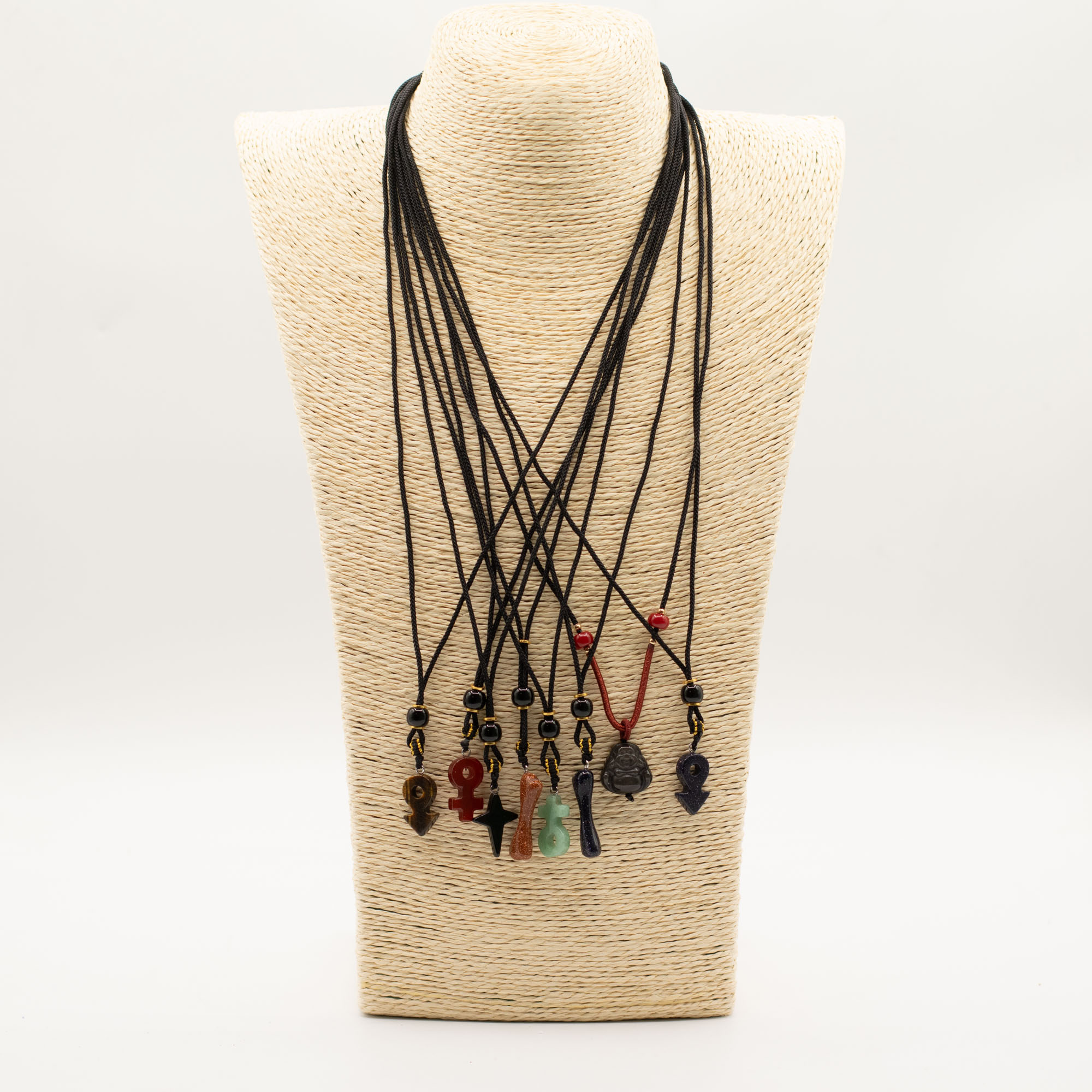 Het assortiment bevat bekende motieven zoals kruisen, symbolische emblemen, Boeddhafiguren en andere betekenisvolle vormen. Elke hanger is gesneden uit natuurlijke edelstenen, met variaties in kleur, patroon en afwerking die de authenticiteit van elk stuk versterken.