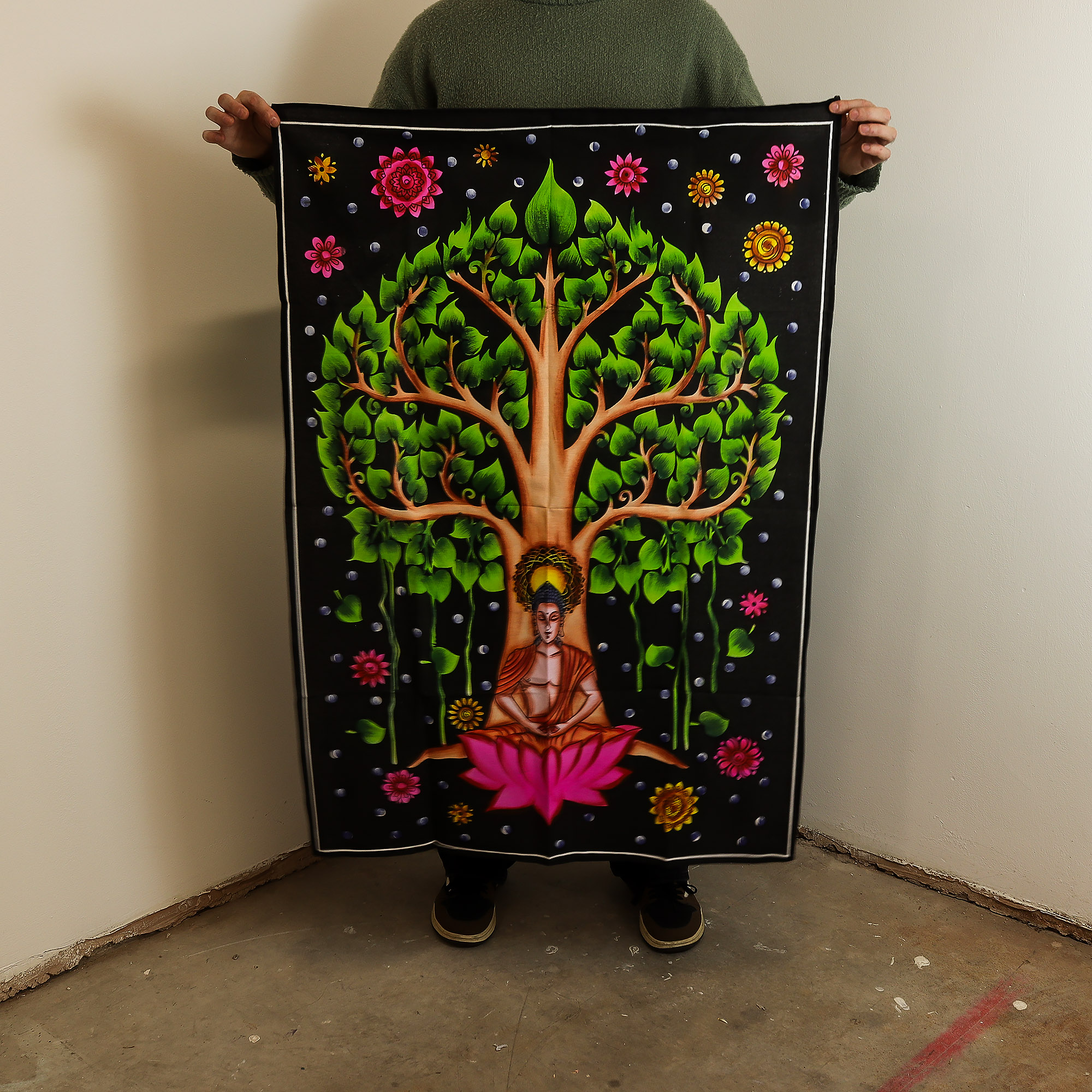 Dit rustgevende Indiase wandkleed toont de Boeddha mediterend onder de Bodhiboom, een tijdloos symbool van verlichting en vrede.