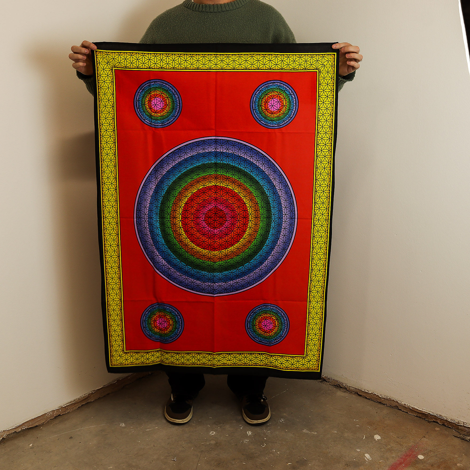 Dit opvallende Indiase wandkleed toont de heilige Flower of Life — een geometrisch patroon dat eenheid, creatie en verbinding symboliseert. De levendige concentrische cirkels brengen balans en positiviteit, waardoor het populair is bij klanten die zich aangetrokken voelen tot spirituele of geometrische kunst.