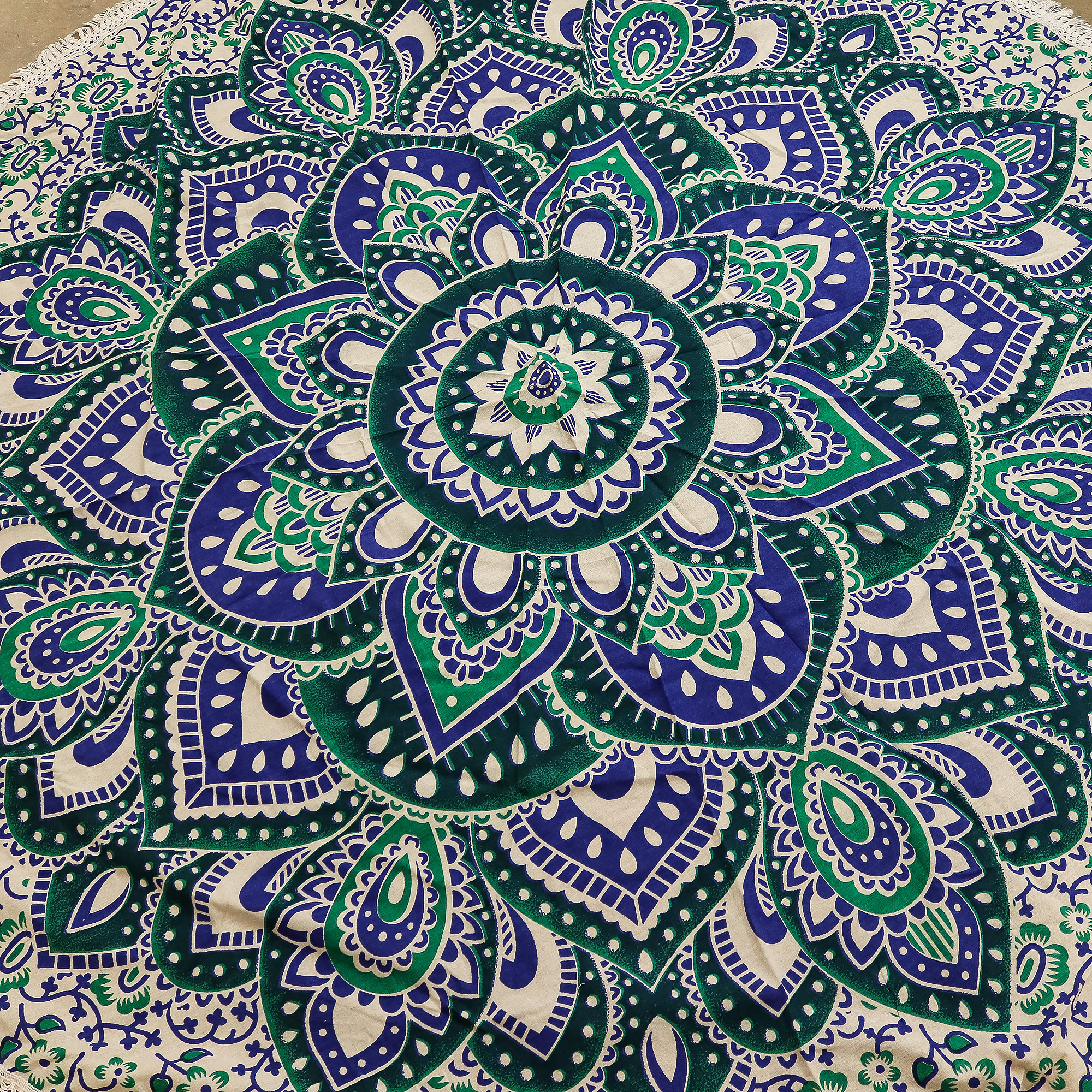 Dit roundie-artikel combineert koele teal- en blauwtinten tot een sereen, door de oceaan geïnspireerd ontwerp dat rust en focus uitstraalt. Afkomstig uit India, bevat het de mandala — een eeuwenoud symbool van balans en meditatie — waardoor het ideaal is voor interieurdecoratie, wellness- en spirituele winkels.