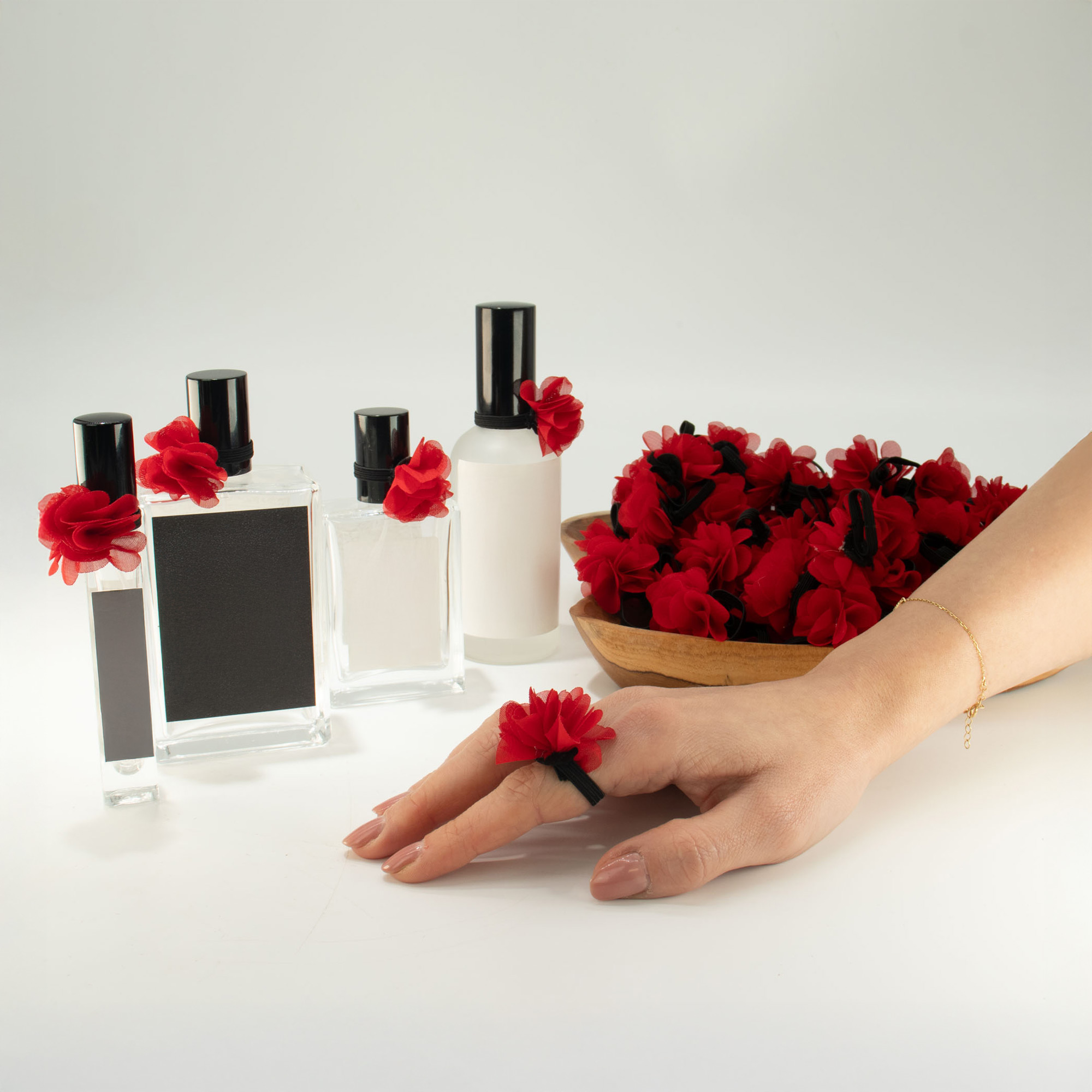 Deze Rose Red Chiffon Geurkransen worden geleverd in verpakkingen van 100 en bieden een creatieve manier om geuren te presenteren en te testen in winkels. Elke ring heeft een zachte chiffonbloem bevestigd aan een flexibel elastisch bandje, ontworpen om parfum of geurolie te absorberen en de geur geleidelijk vrij te geven.