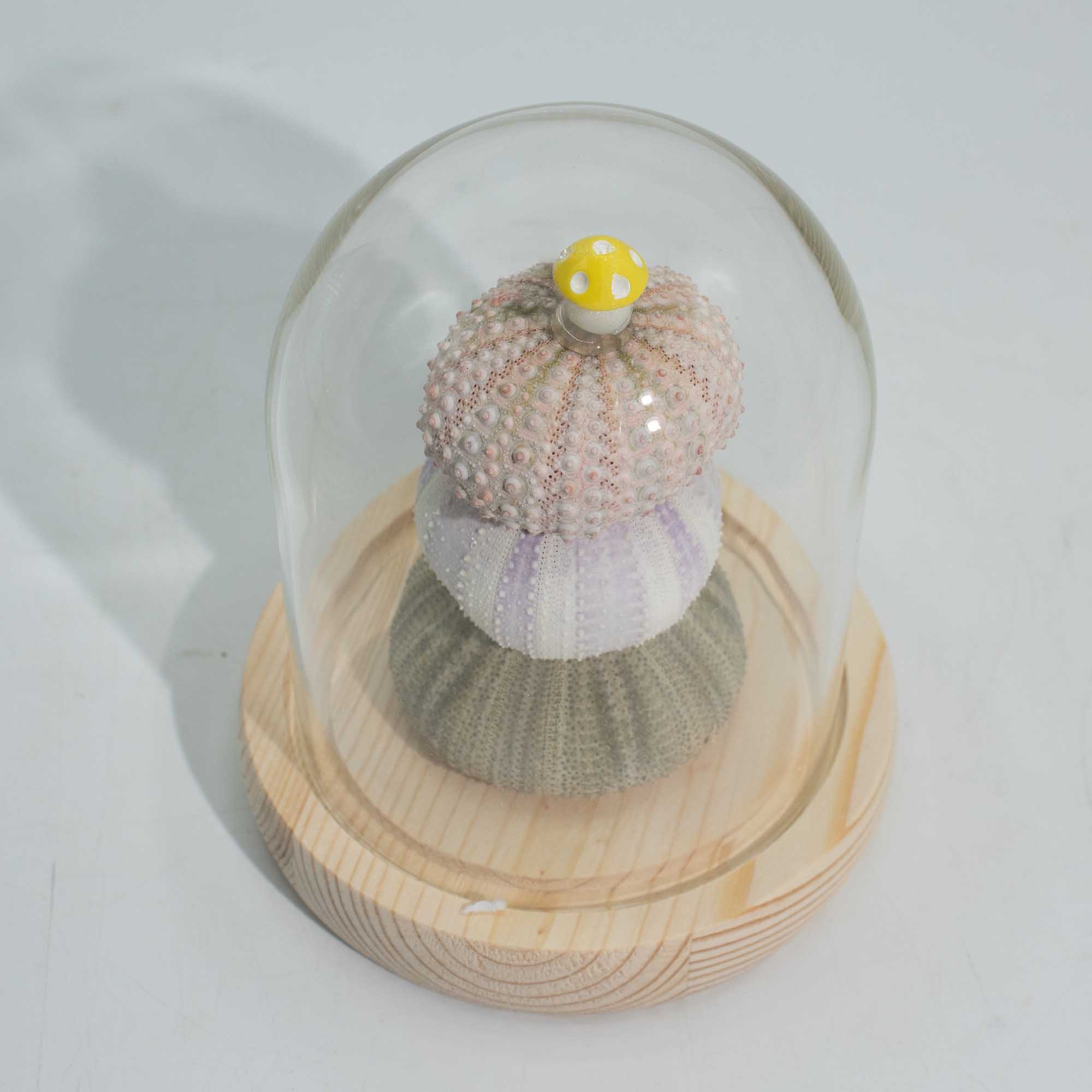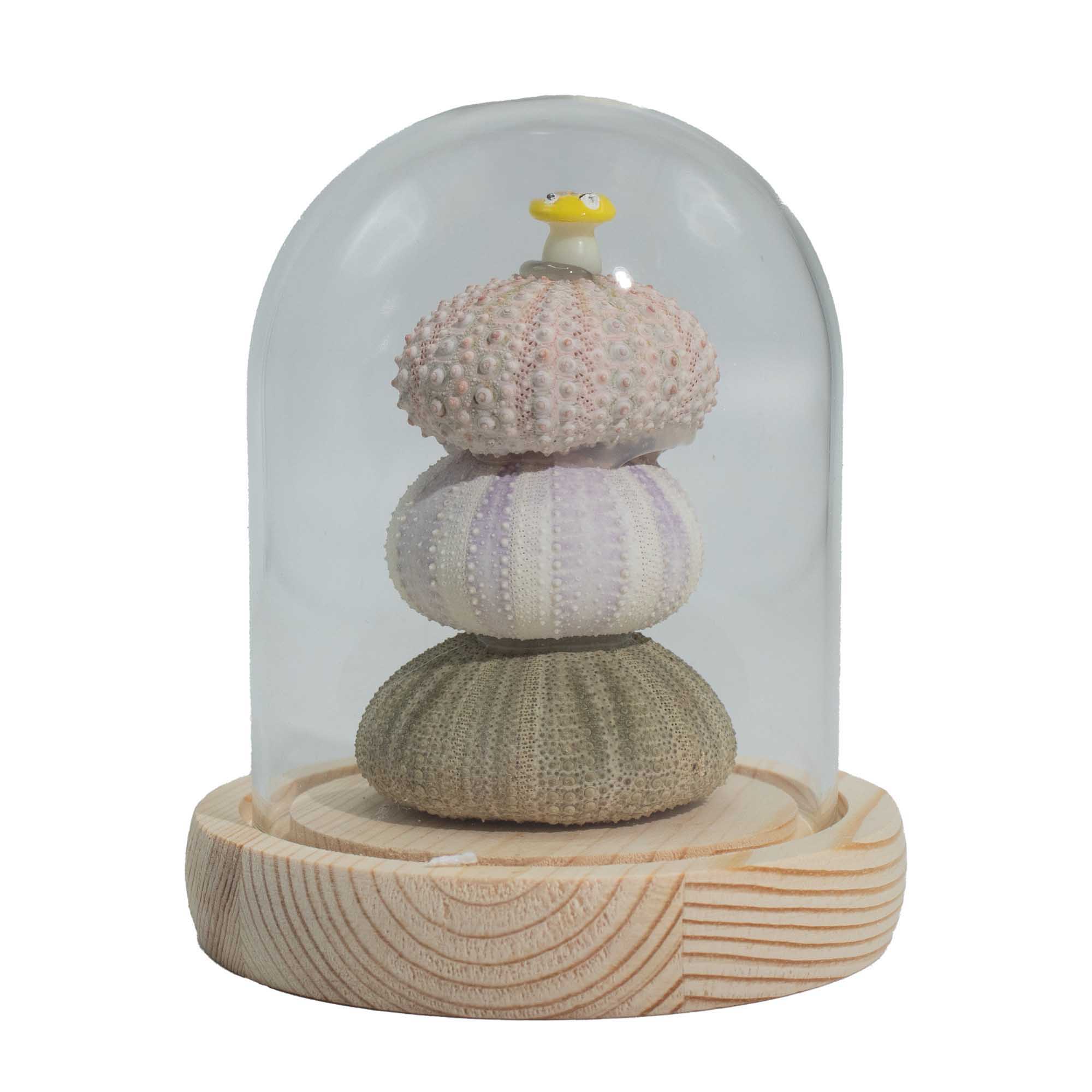 De Floral Glow Tuin Koepel – 3 Zee-egels voegt een sculpturaal, designgericht element toe aan de collectie. In plaats van bloemmotieven ligt de focus van dit stuk op vorm, balans en oppervlaktedetails. De drie zee-egelvormen zijn gestapeld onder een heldere glazen koepel, waardoor een klein sculpturaal accent ontstaat dat de aandacht trekt door textuur en proportie in plaats van kleur.