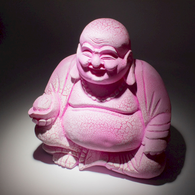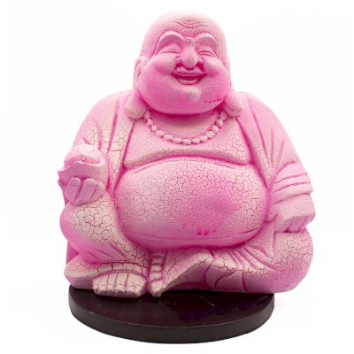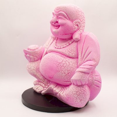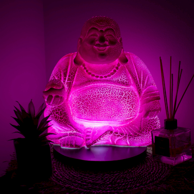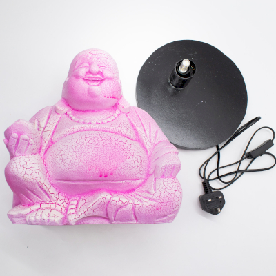 Gemaakt met een hoogwaardige glasvezelkap, heeft de lamp een opvallend crackle-gepatenteerd oppervlak dat diepte en visuele interesse toevoegt. Wanneer de lamp uitstaat, toont hij een sculpturale, decoratieve afwerking; wanneer hij aan is, straalt hij een opvallend roze-magenta licht uit dat de vrolijke uitstraling van het Boeddhabeeld versterkt.