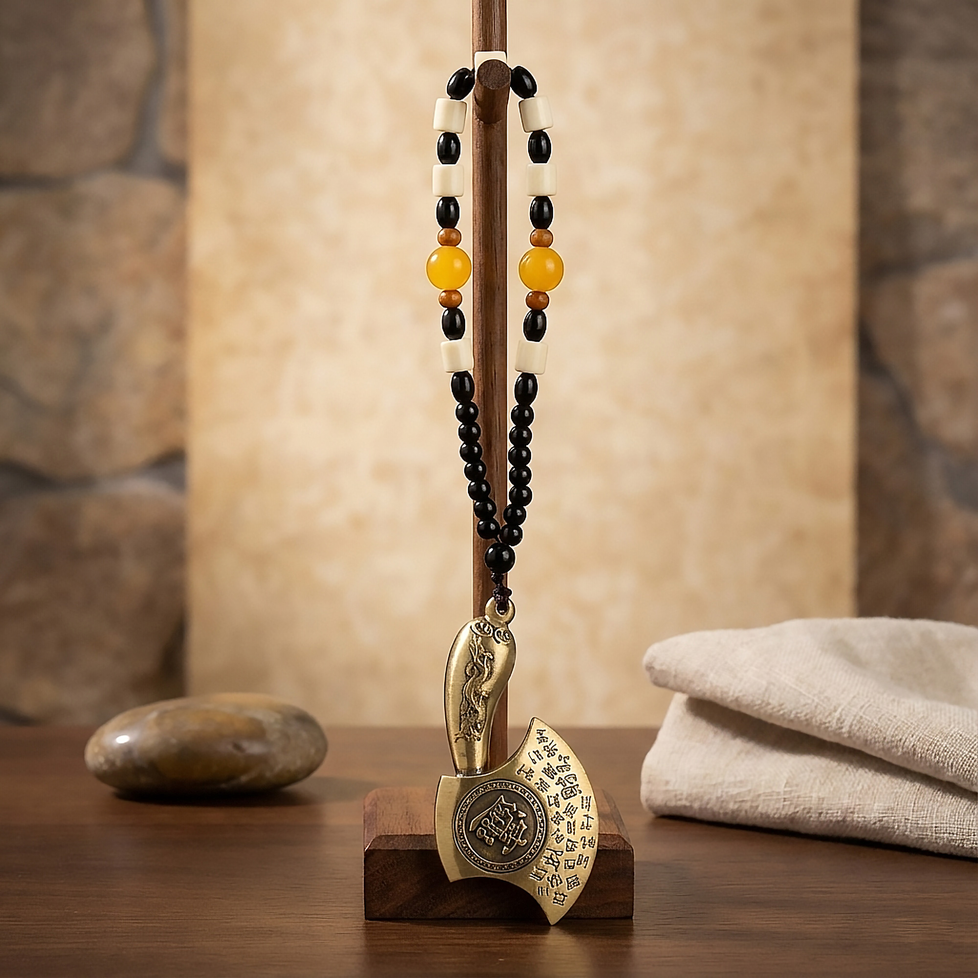 Deze Feng Shui Hangende Bijl is gebaseerd op een traditionele ceremoniële bijl en symboliseert autoriteit, bescherming en het veiligstellen van rijkdom. In de Feng Shui-praktijk staan bijlmotieven voor controle over middelen en het bewaken van welvaart, niet voor geweld of conflict. Het stuk combineert symbolische betekenis met decoratieve aantrekkingskracht, waardoor het geschikt is voor zowel spirituele ruimtes als interieurgerichte settings.