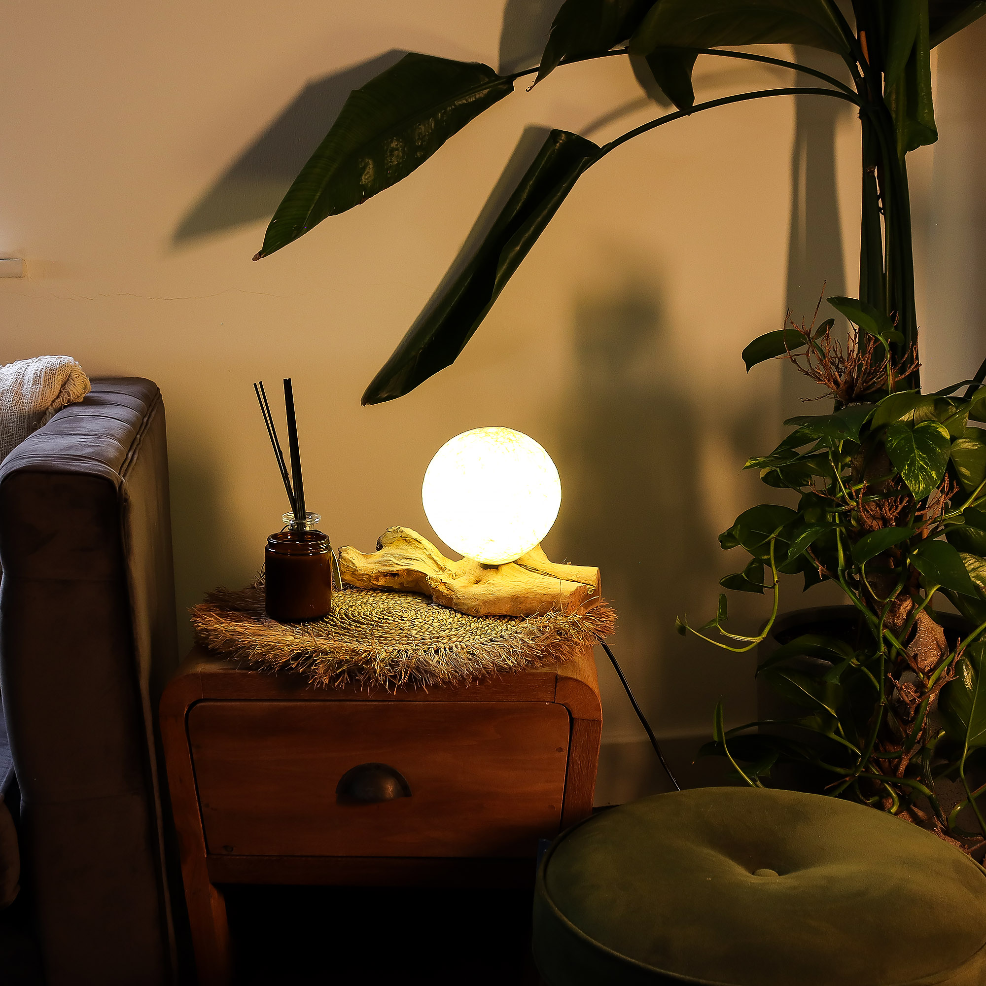 Deze lamp verspreidt een warme, zachte gloed waar klanten direct een gevoel mee hebben. De Cotton Wrap Cream-kap heeft een subtiele, met de hand omwikkelde uitstraling die prachtig oplicht en precies die knusse, goudachtige sfeer creëert waar shoppers van houden in slaapkamers, leeshoekjes en ontspannen woonruimtes. Geplaatst op een natuurlijke Indonesische drijfhouten voet krijgt elke lamp een aardse, organische uitstraling – en omdat elk stuk hout uniek is, wordt elke lamp een echte blikvanger.