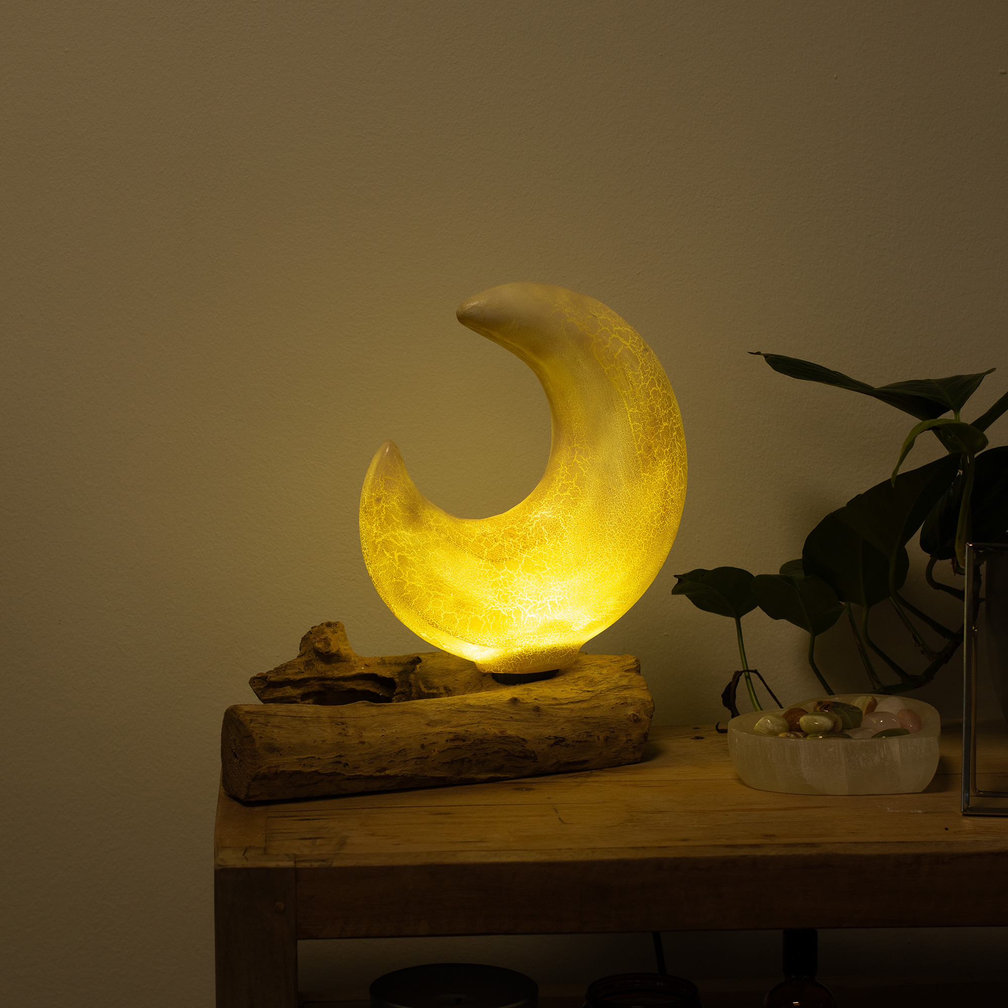 Deze lamp verspreidt een zachte, gouden gloed die een ruimte direct warmte geeft. De Crackle Halvemaan kap heeft een vloeiende, sculpturale vorm met een subtiele crackle-afwerking die het licht prachtig vangt. Wanneer de lamp aanstaat, straalt de gele tint rustig en sfeervol, zonder de ruimte te overheersen.