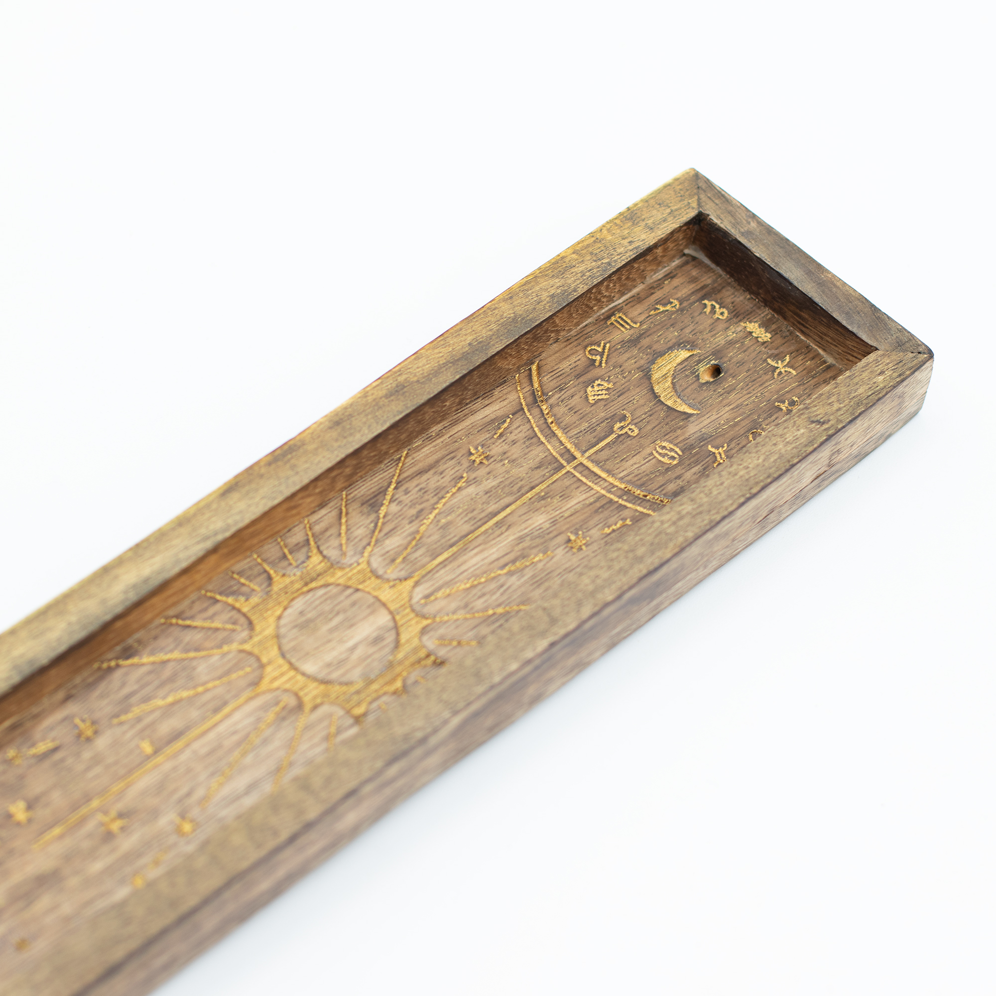 Gemaakt van hout met een warme, rustieke toon. Elke tray is voorzien van een zonnestraalmotief omringd door dierenriemtekens. Er is een speciaal gleufje voor stokwierook, en de opstaande randen helpen om de as netjes op te vangen.