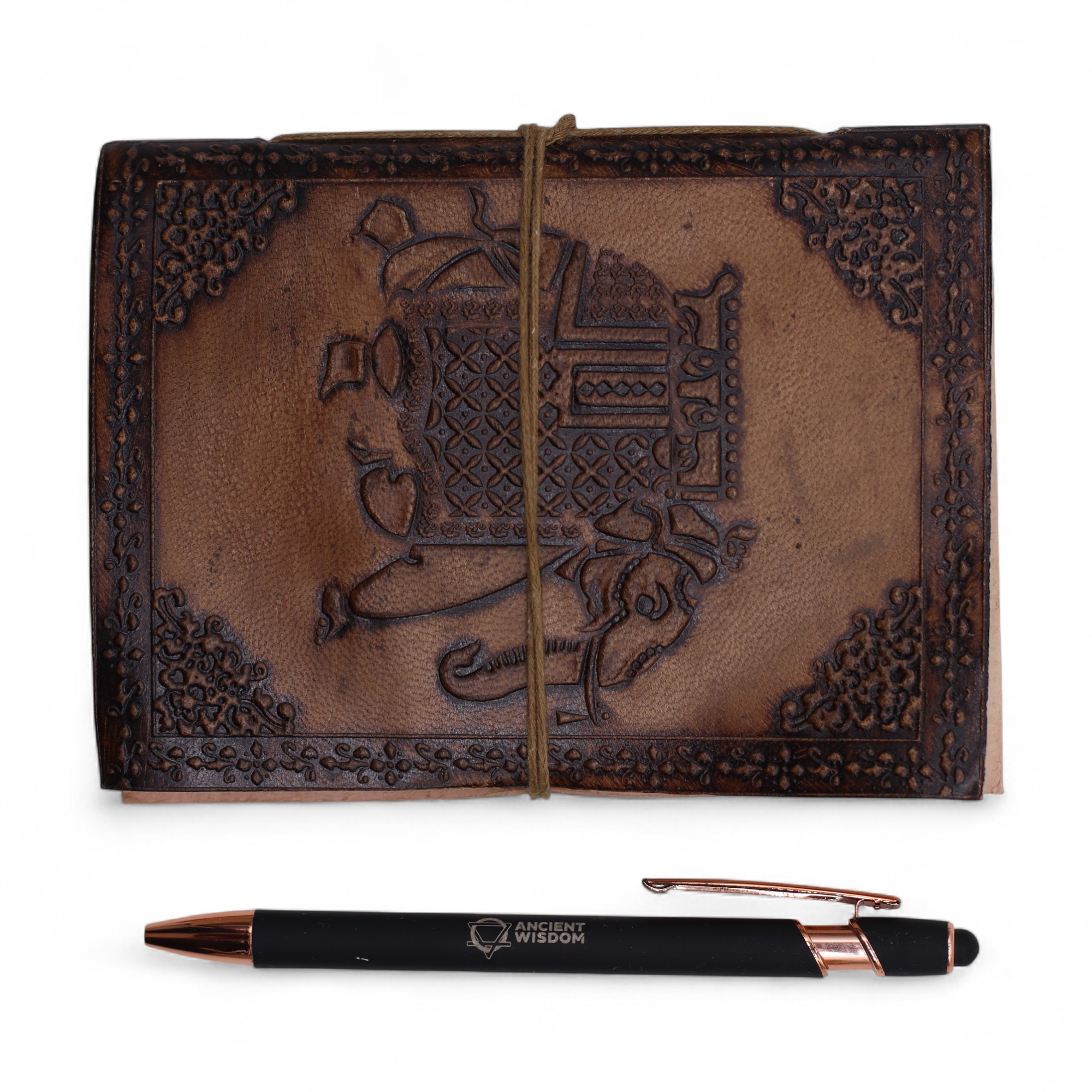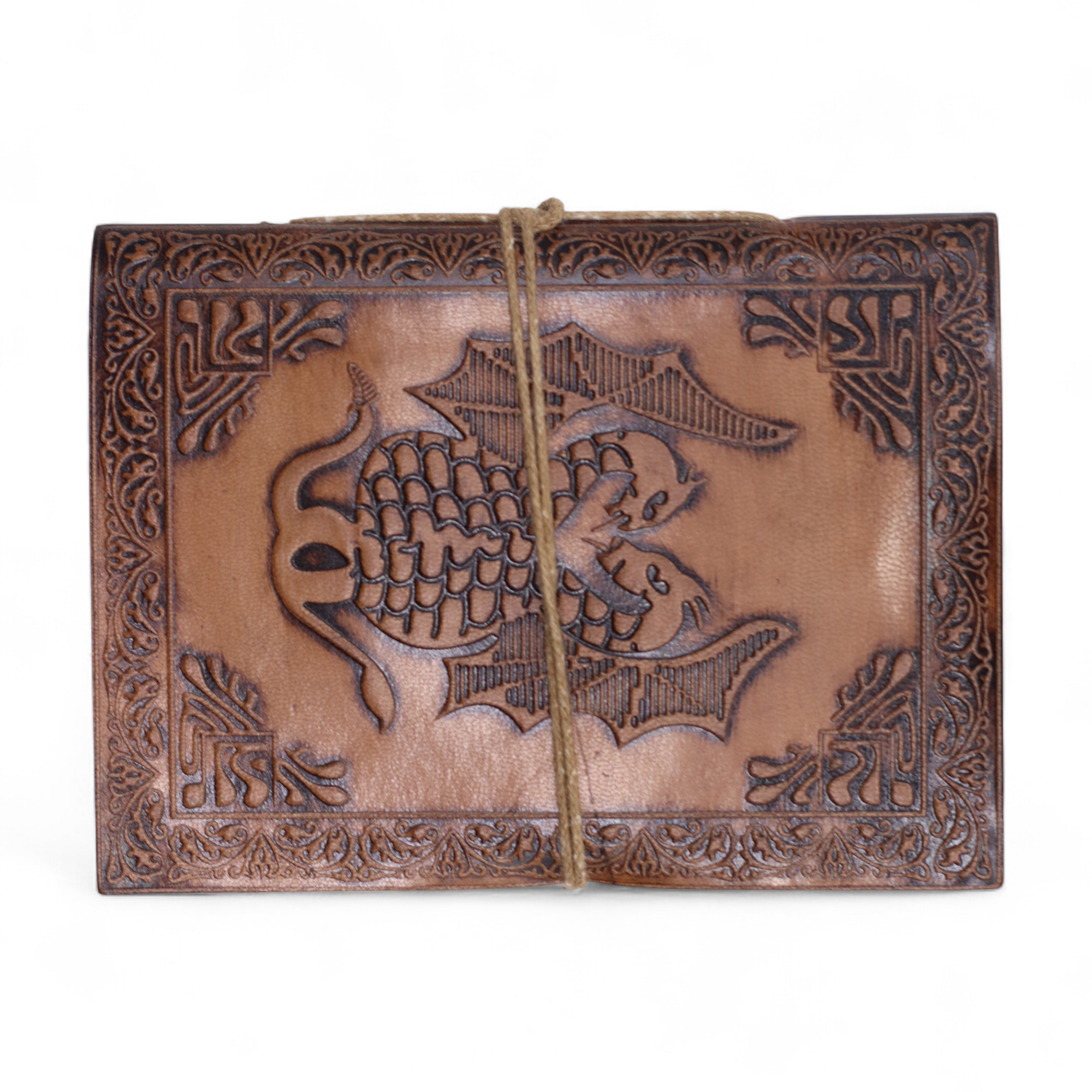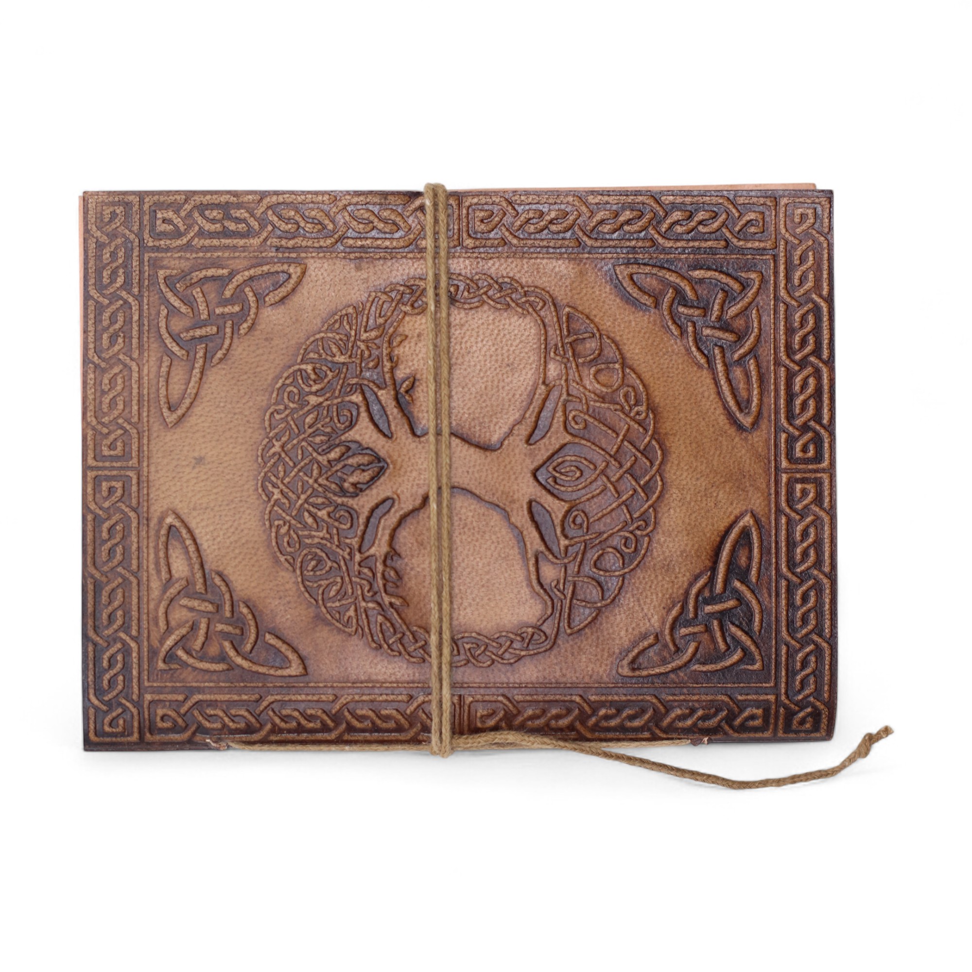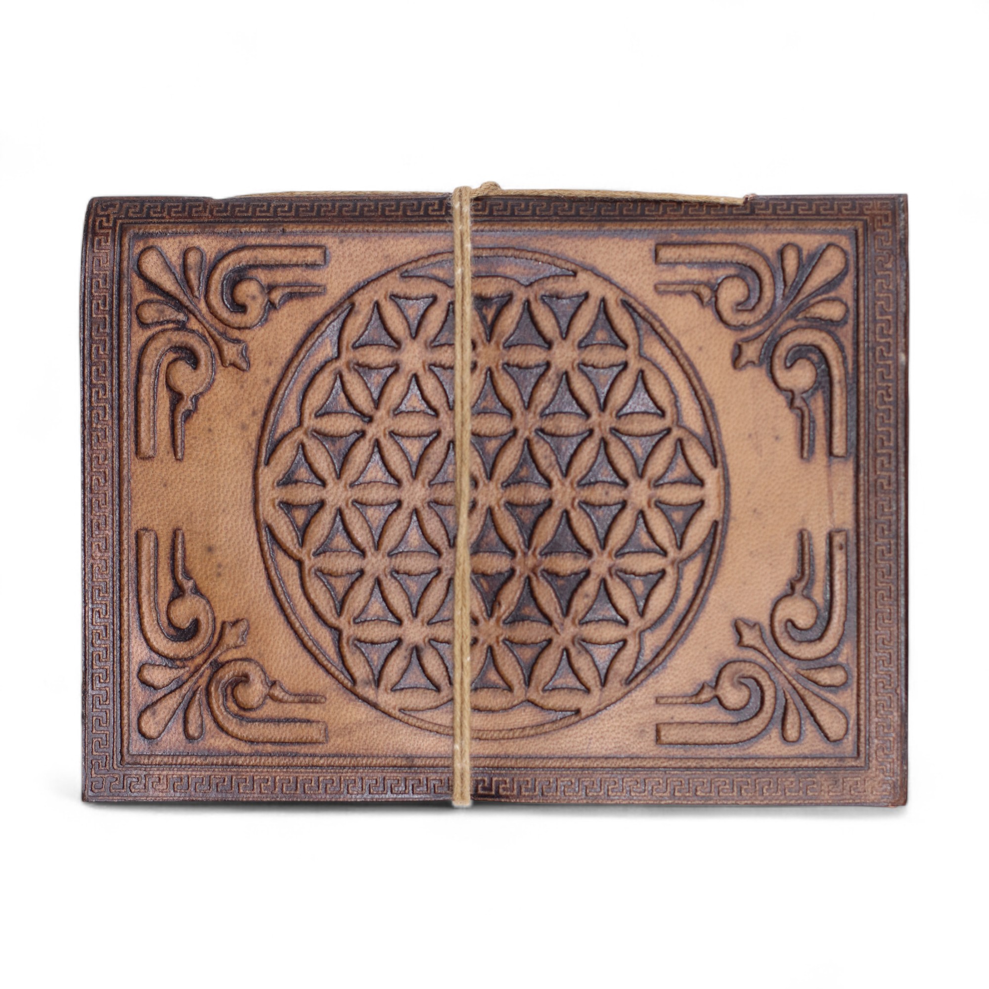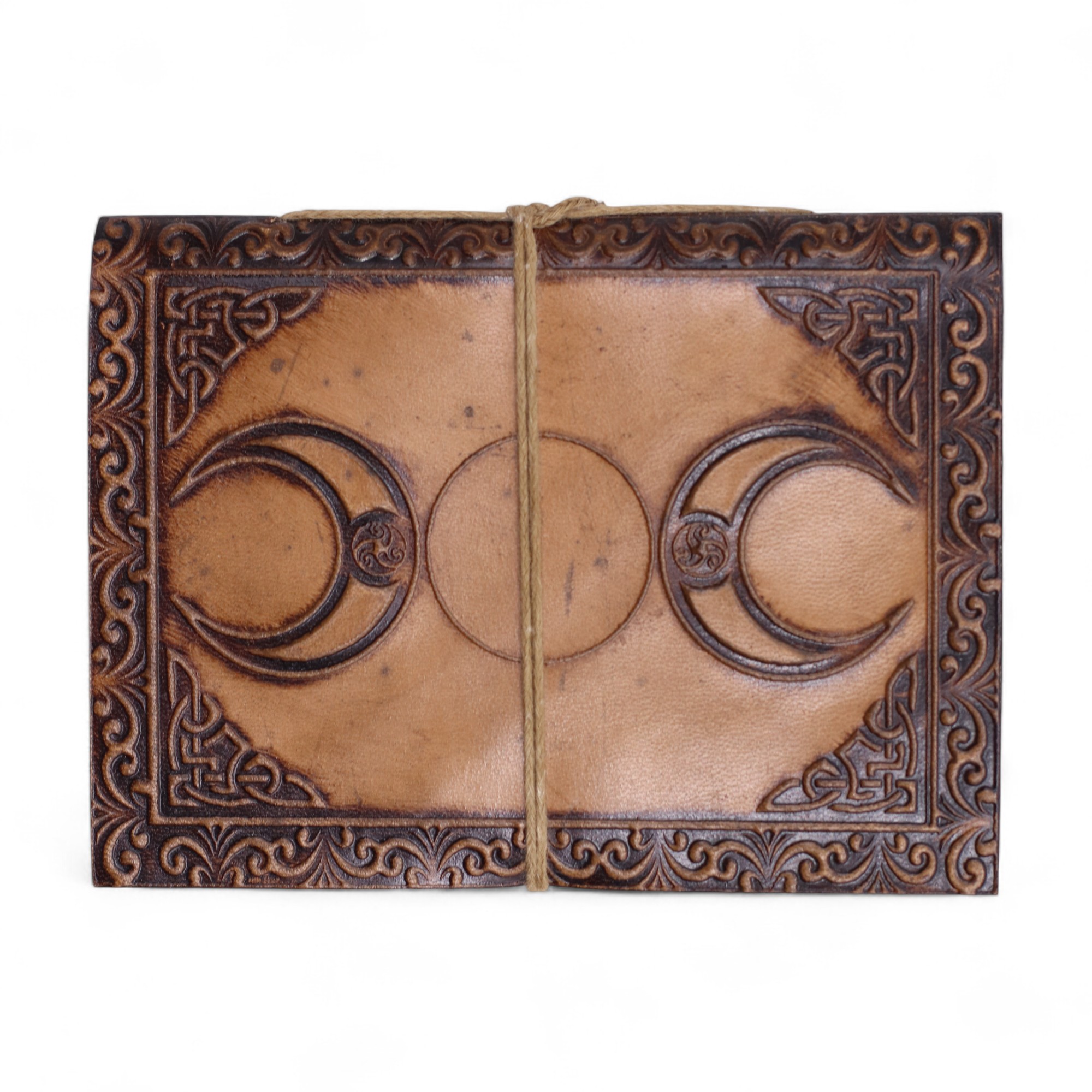 Elk notitieboek is handgemaakt van leer en geperst met mystieke en esoterische symbolen — van hemelse motieven tot alchemistische tekens die transformatie en spirituele groei vertegenwoordigen. Het resultaat is een display dat zowel inspireert als de aandacht trekt.