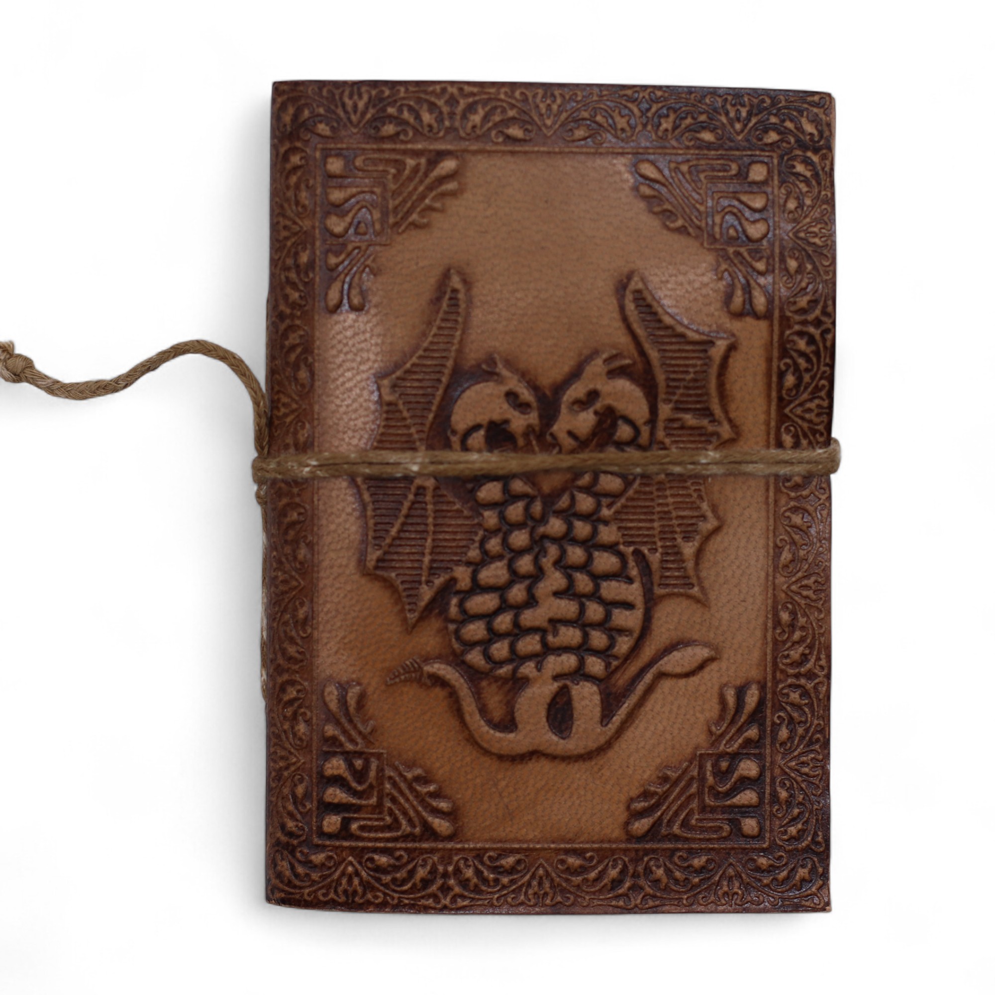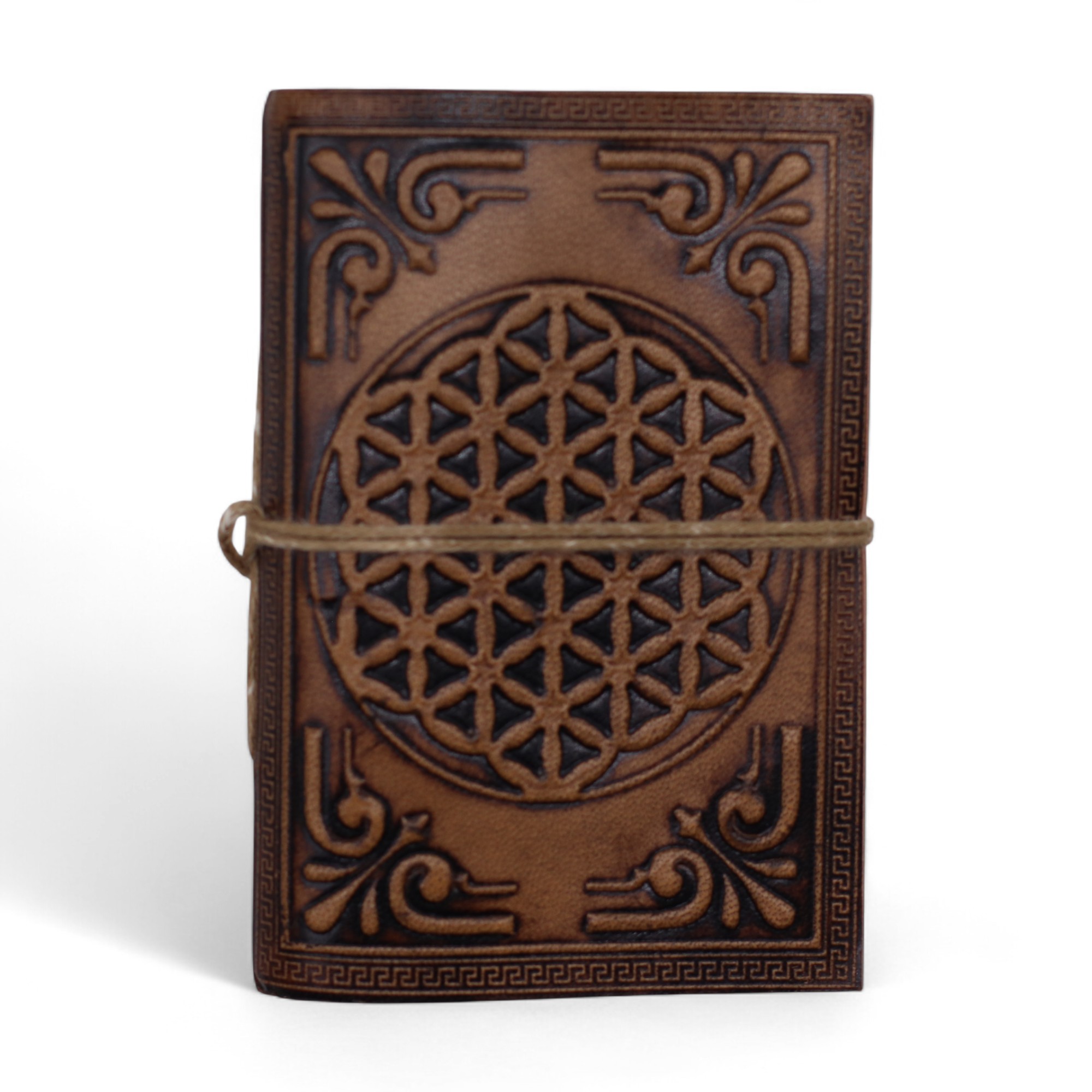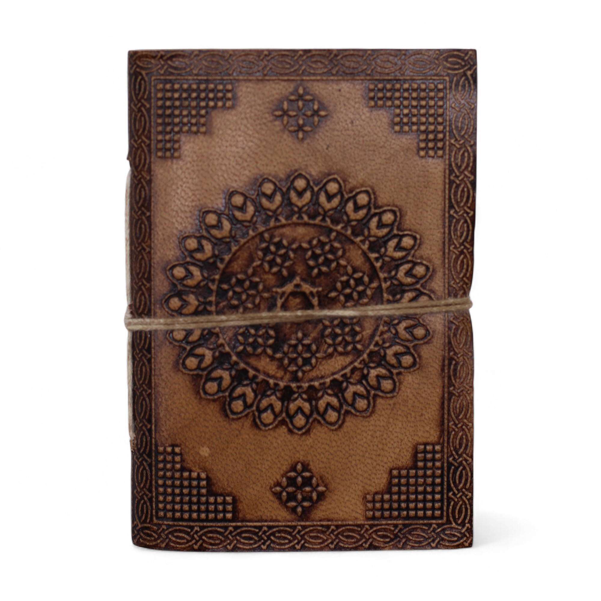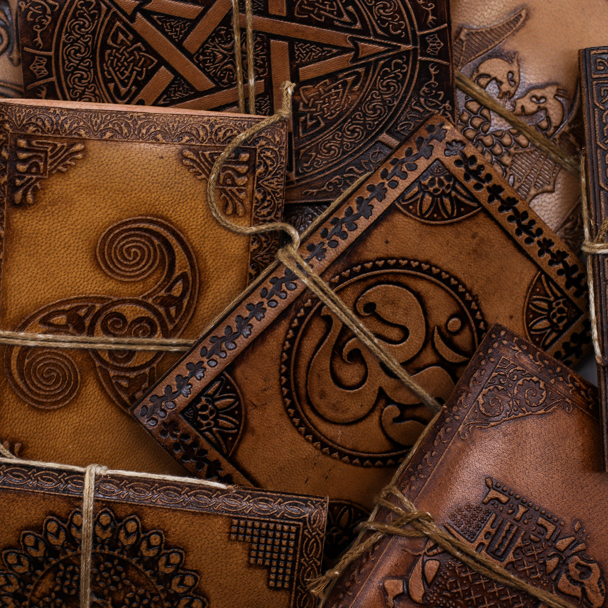 Elk boekje is geperst met spirituele en mystieke motieven — zoals manen, draken en heilige symbolen — die staan voor begeleiding, intuïtie en balans. De assortimentsset biedt visuele diversiteit terwijl het handgemaakte, samenhangende uiterlijk behouden blijft.