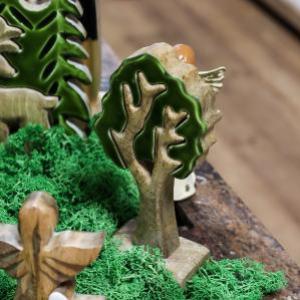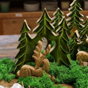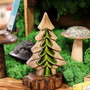 Het assortiment omvat alles van charmante boomfiguren tot serene hertenscènes en combineert rustieke houtstructuren met levendige groene emaillerelementen – perfect voor een opvallende en sfeervolle presentatie. De collectie bestaat uit zowel decoratieve figuren als functionele schalen in de vorm van bladeren en dennenbomen, geschikt voor het hele jaar door.