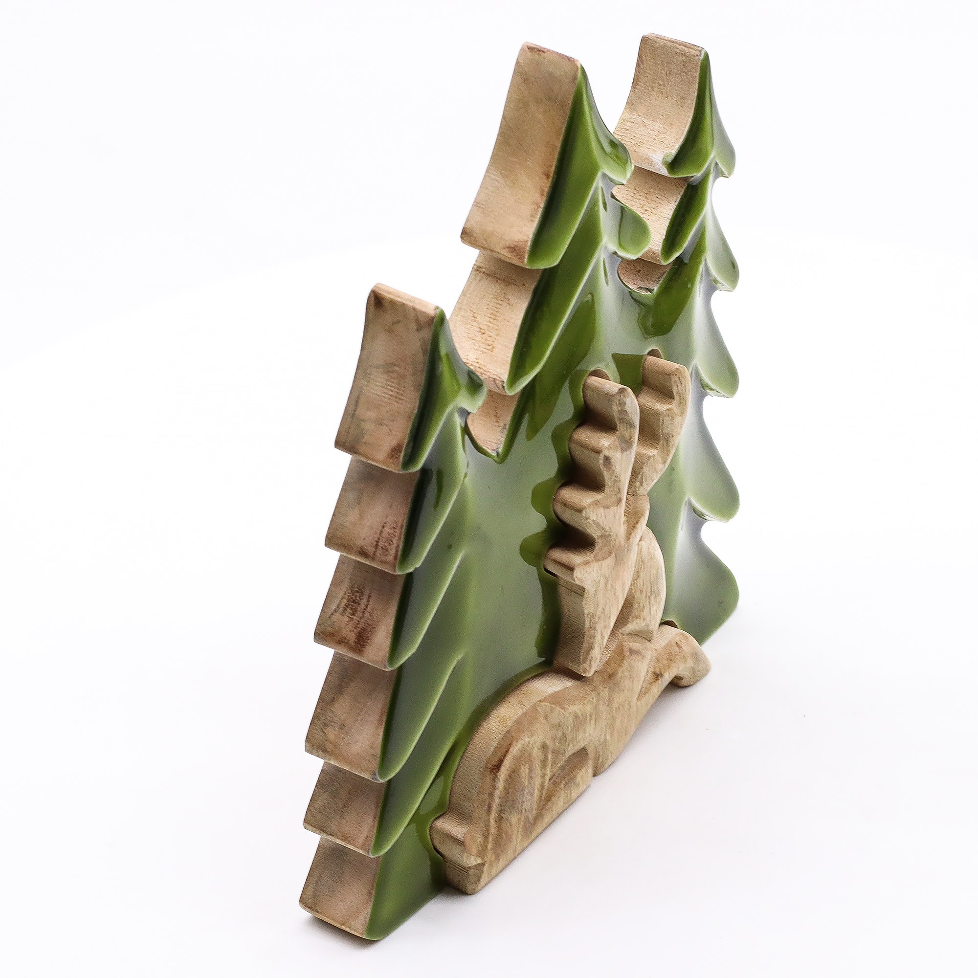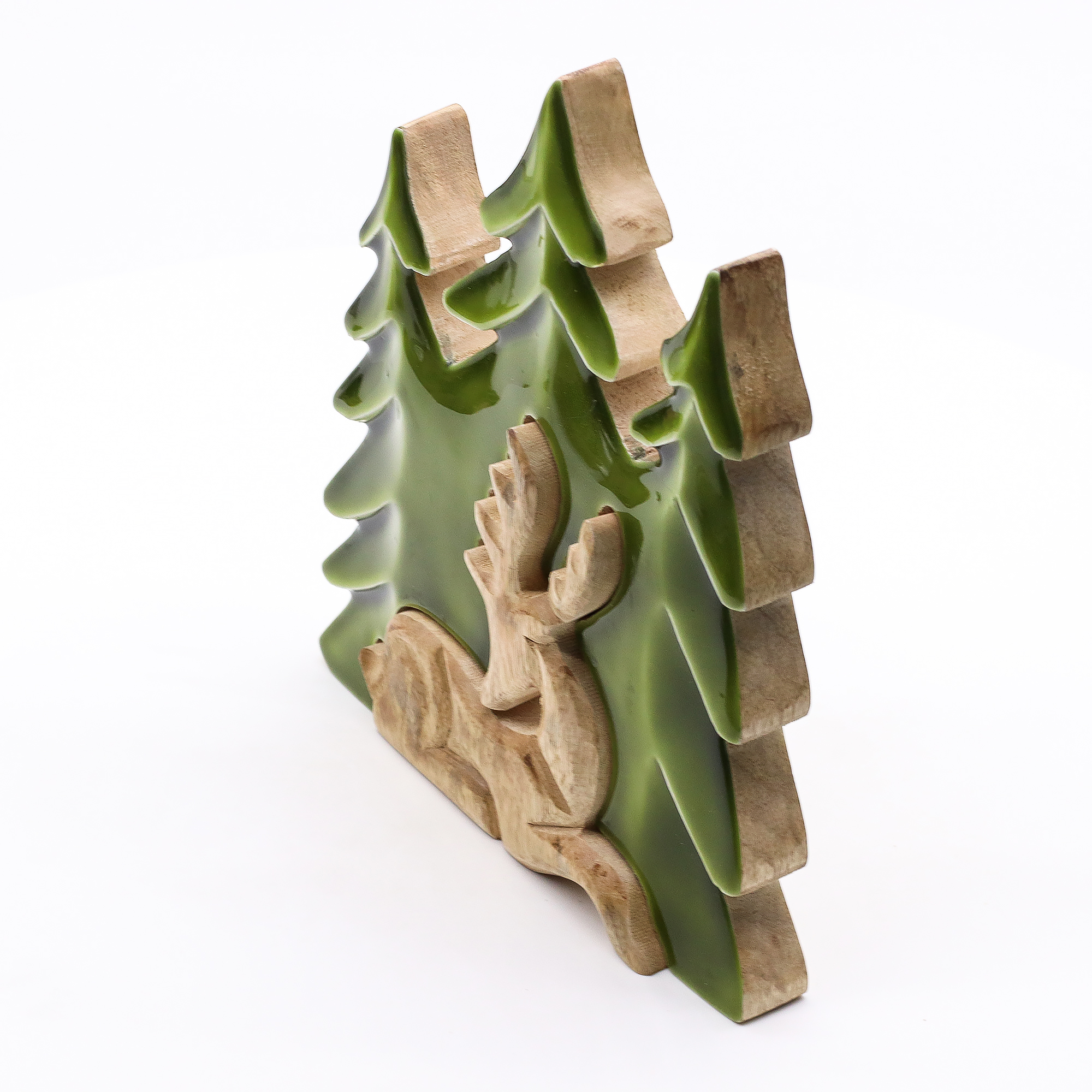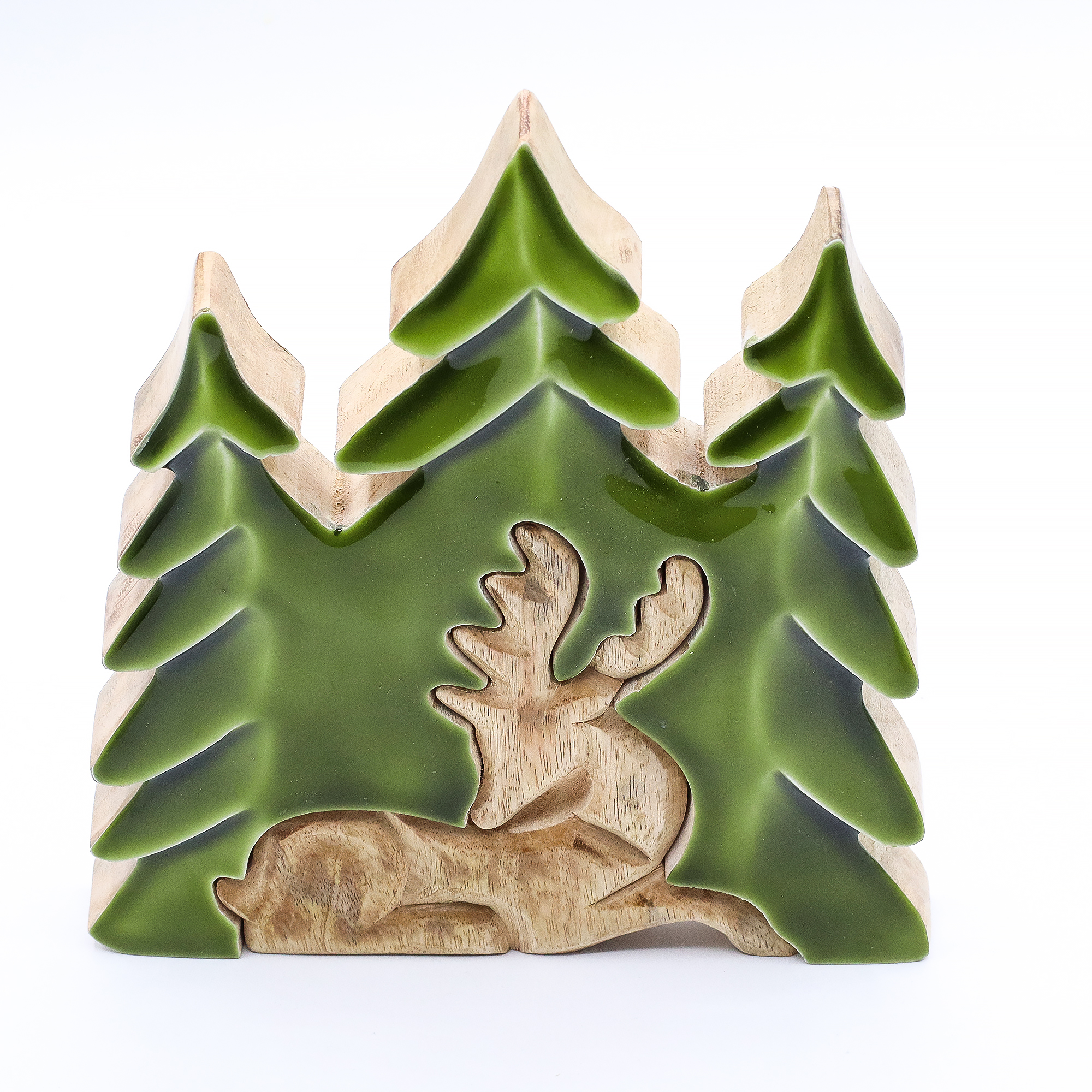 Deze indrukwekkende Hert in het Bos 3D Houten Decoratie vangt de majesteit van het boswild op krachtige wijze. Met de hand gesneden in India uit duurzaam mangohout, toont dit stuk een opvallend 3D-ontwerp van een hert in een bosrijke omgeving. De rijke, glanzende emaille afwerking combineert rustieke textuur met levendige groentinten en roept zo de diepte en rust van de natuur op. Fair trade en ethisch vervaardigd, is dit een krachtig middelpunt voor natuur-geïnspireerde displays of een betekenisvol geschenk.