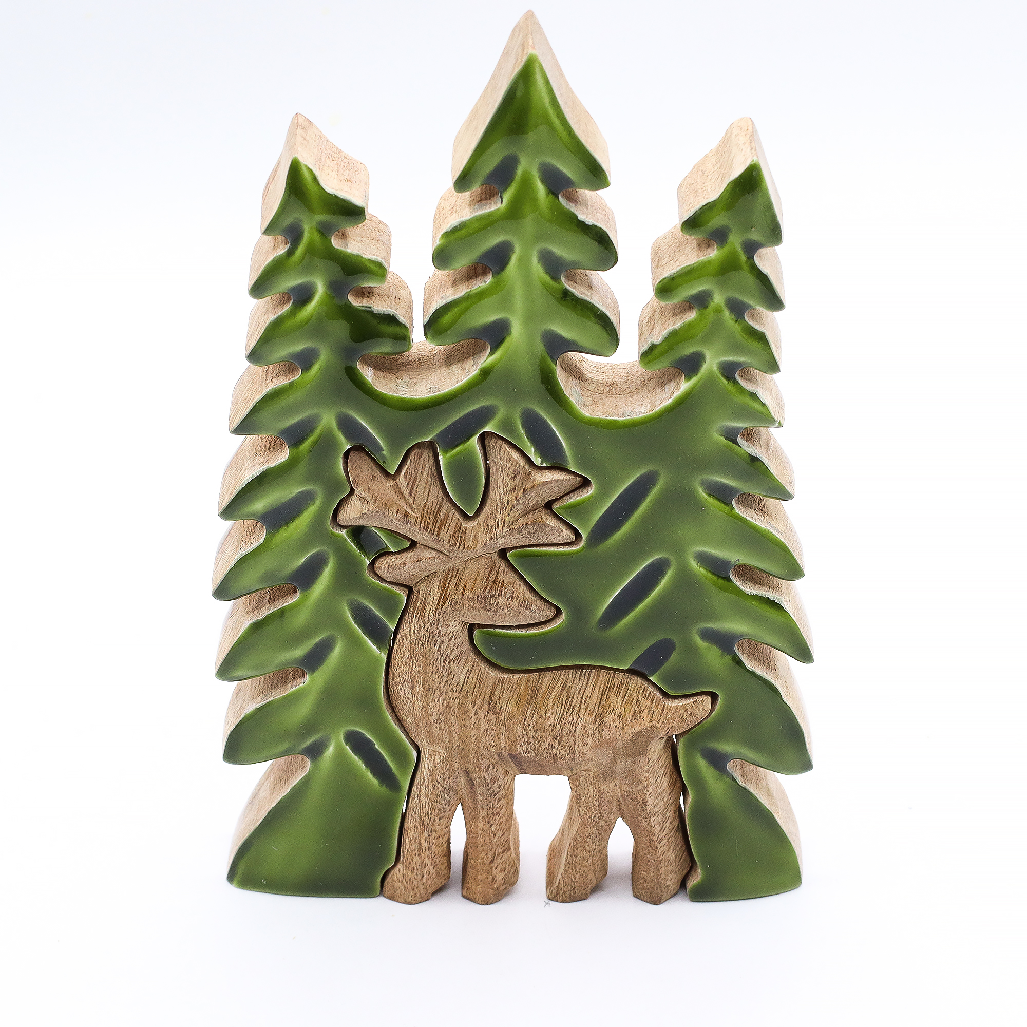 Deze indrukwekkende Hert in het Bos 3D Houten Decoratie vangt de grootsheid van het bos op sfeervolle wijze. Met de hand gesneden in India uit duurzaam mangohout, toont dit stuk een opvallende 3D-scène met een hert in een bosrijke omgeving. De rijke, glanzende emaille afwerking zorgt voor een prachtige combinatie van rustiek hout en levendige groene details, waardoor de rust van de natuur naar binnen wordt gebracht. Fair trade en ethisch geproduceerd is dit een schitterend middelpunt voor natuurthema-presentaties of een bijzonder geschenk. Ook zeer geschikt als indrukwekkende kerstdecoratie.