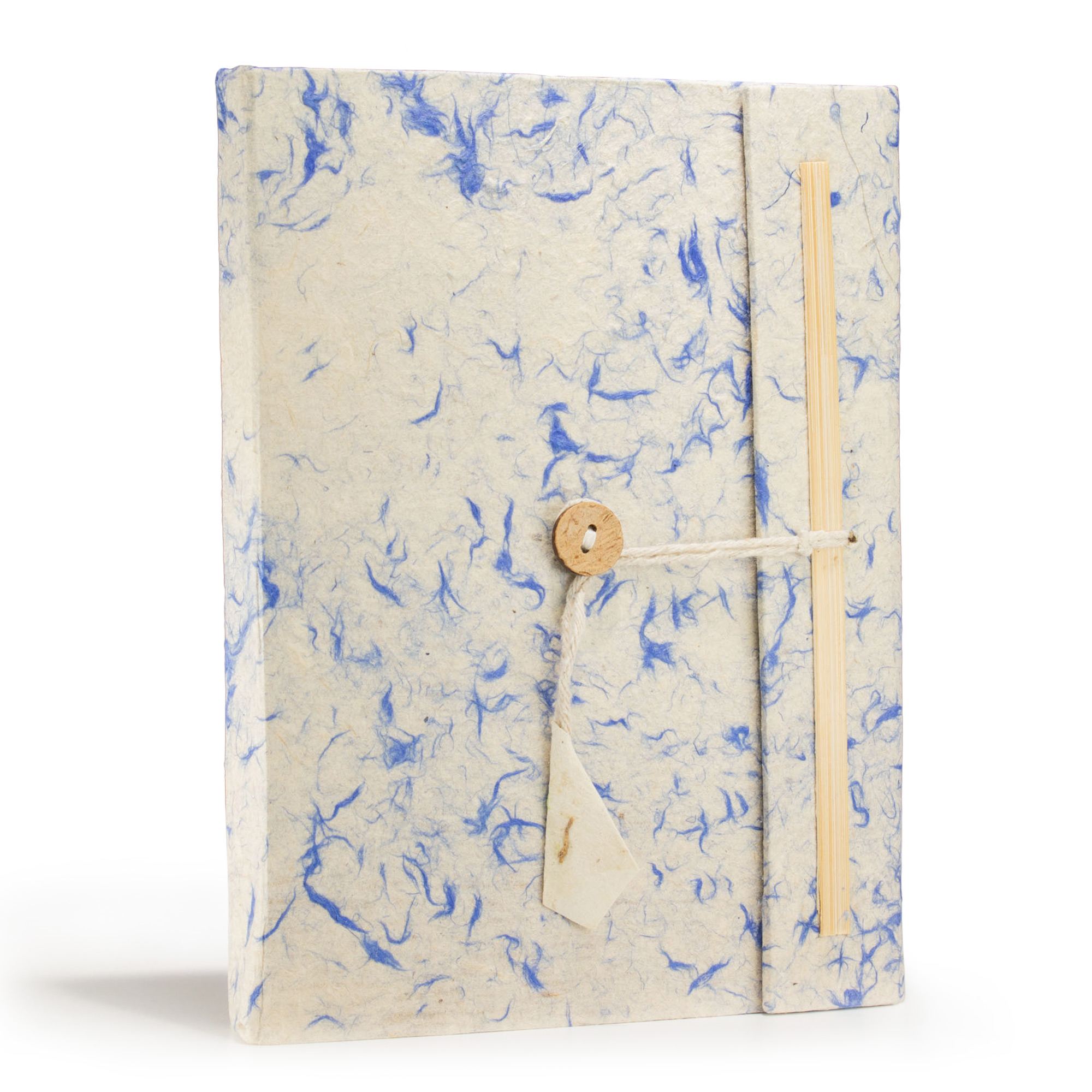 Dit grote notitieboek heeft een handgemaakte Lokta-papieren omslag, gespikkeld met gerecyclede blauwe katoenvezels, wat het een zachte, bewolkte textuur geeft. Met 45 blanco pagina’s en een bijpassende Lokta-bladwijzer, biedt het zowel schoonheid als functionaliteit. De koordsluiting voegt een rustieke afwerking toe, waardoor dit notitieboek ideaal is voor creatieve journaling of als cadeau.