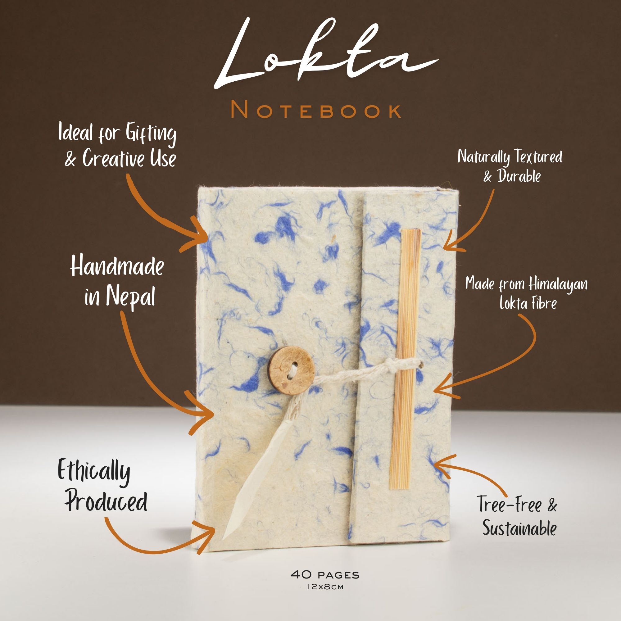 Dit pocketformaat notitieboekje bevat natuurlijk Lokta papier, geaccentueerd met zachte blauwe katoenvezels, wat een subtiele gemarmerde uitstraling creëert. Met 40 blanco pagina's is het perfect voor lijstjes, snelle notities of reisjournaling.