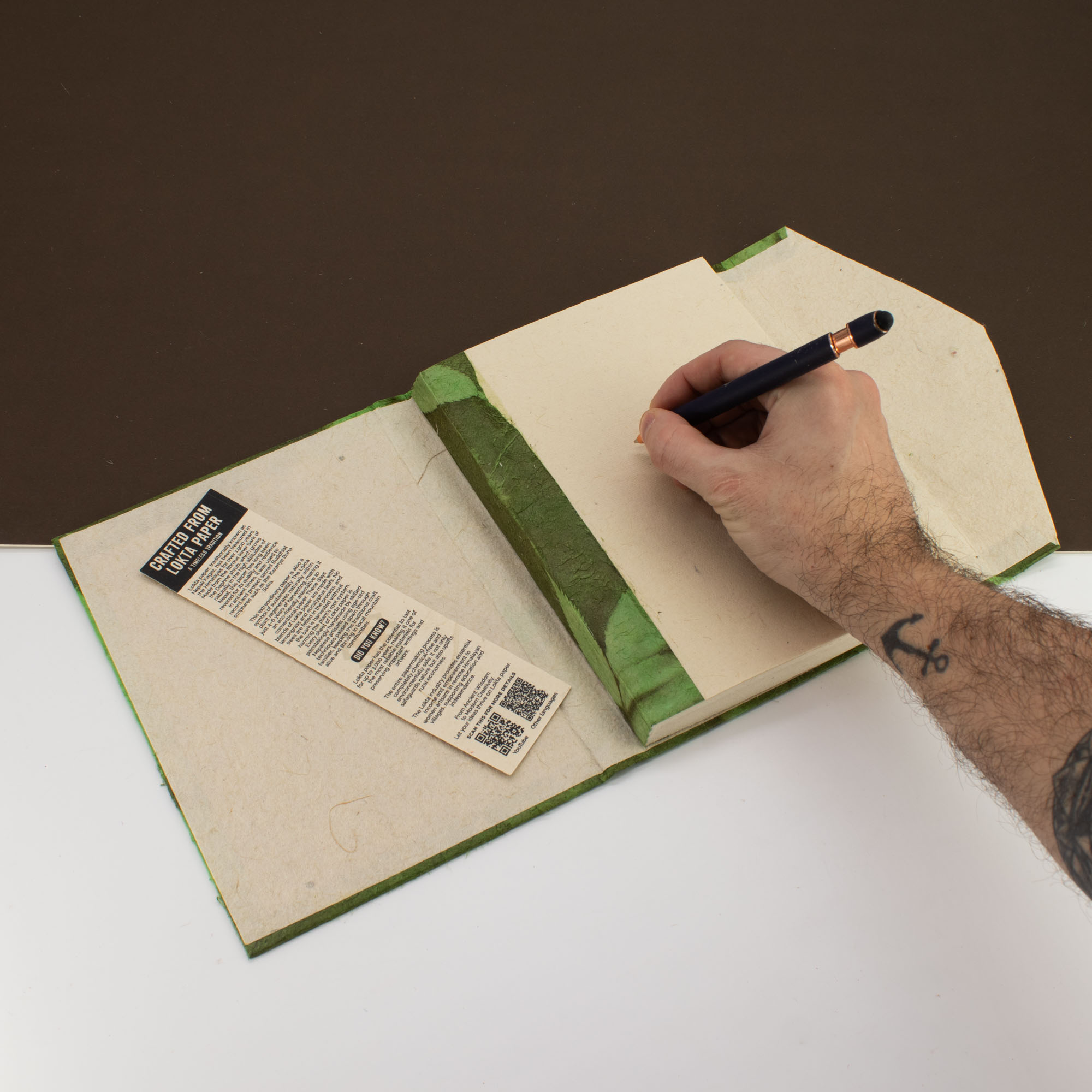 De mosgroene omslag is afgewerkt met geperste botanische details en natuurlijke kleurstoffen, wat zorgt voor een rustige, organische uitstraling. Hierdoor past het notitieboek moeiteloos binnen lifestyle-, stationery-, cadeau- en mindful living-winkels. De houten sluiting en stoffen bladwijzer vormen een praktisch maar ambachtelijk detail en geven het geheel een verzorgde, doordachte afwerking.