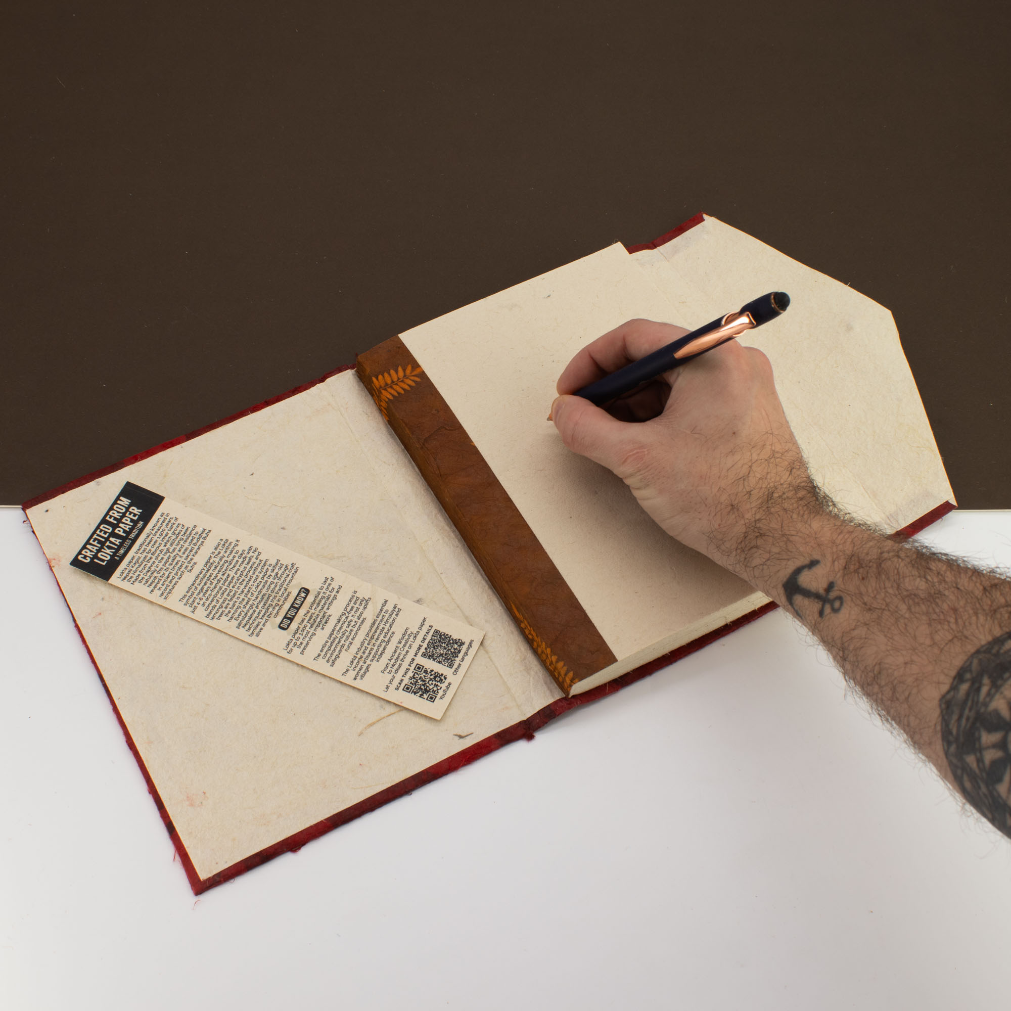 Binnenin bevinden zich 45 handgemaakte pagina’s die volop ruimte bieden voor reflectief journaling, creatief schrijven, schetsen of betekenisvolle notities. Het grotere formaat voelt solide aan in de hand en straalt direct kwaliteit uit, iets wat klanten meteen herkennen en waarderen.