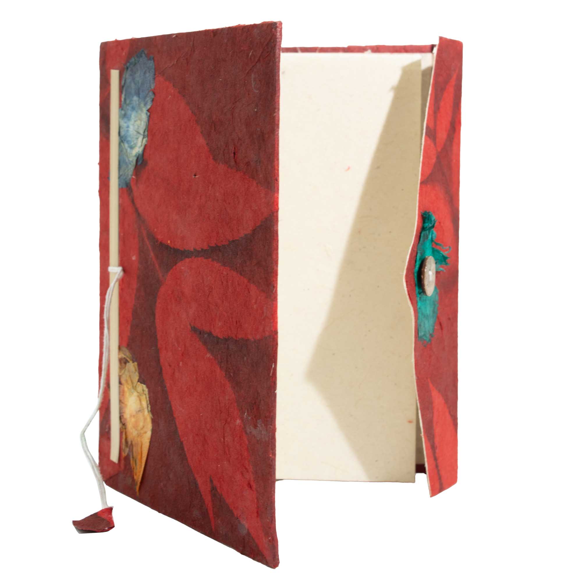 Met de hand vervaardigd in Nepal van traditioneel Lokta papier, toont elk notitieboek een natuurlijke textuur en subtiele onregelmatigheden die de ambachtelijke herkomst onderstrepen. De houten sluiting en stoffen bladwijzer voegen structuur en gebruiksgemak toe, terwijl de uitstraling organisch en authentiek blijft.