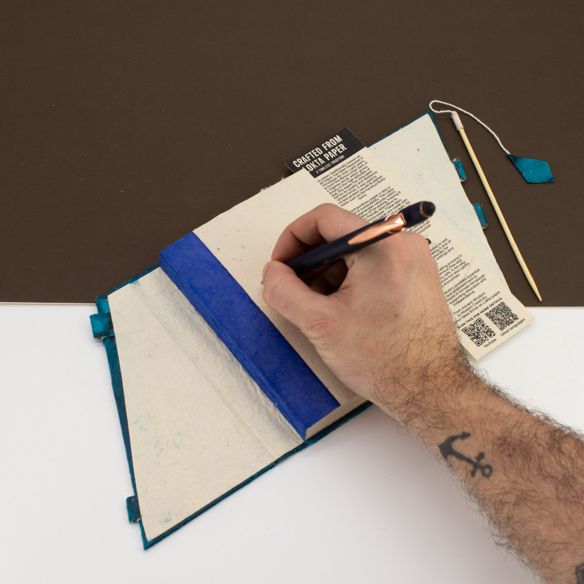 Binnenin bieden 45 handgemaakte pagina’s van Lokta papier een licht gestructureerd schrijfoppervlak dat prettig reageert op pen en potlood. Geschikt voor gerichte notities, snelle schetsen of ideeën onderweg, en ontworpen voor dagelijks gebruik.