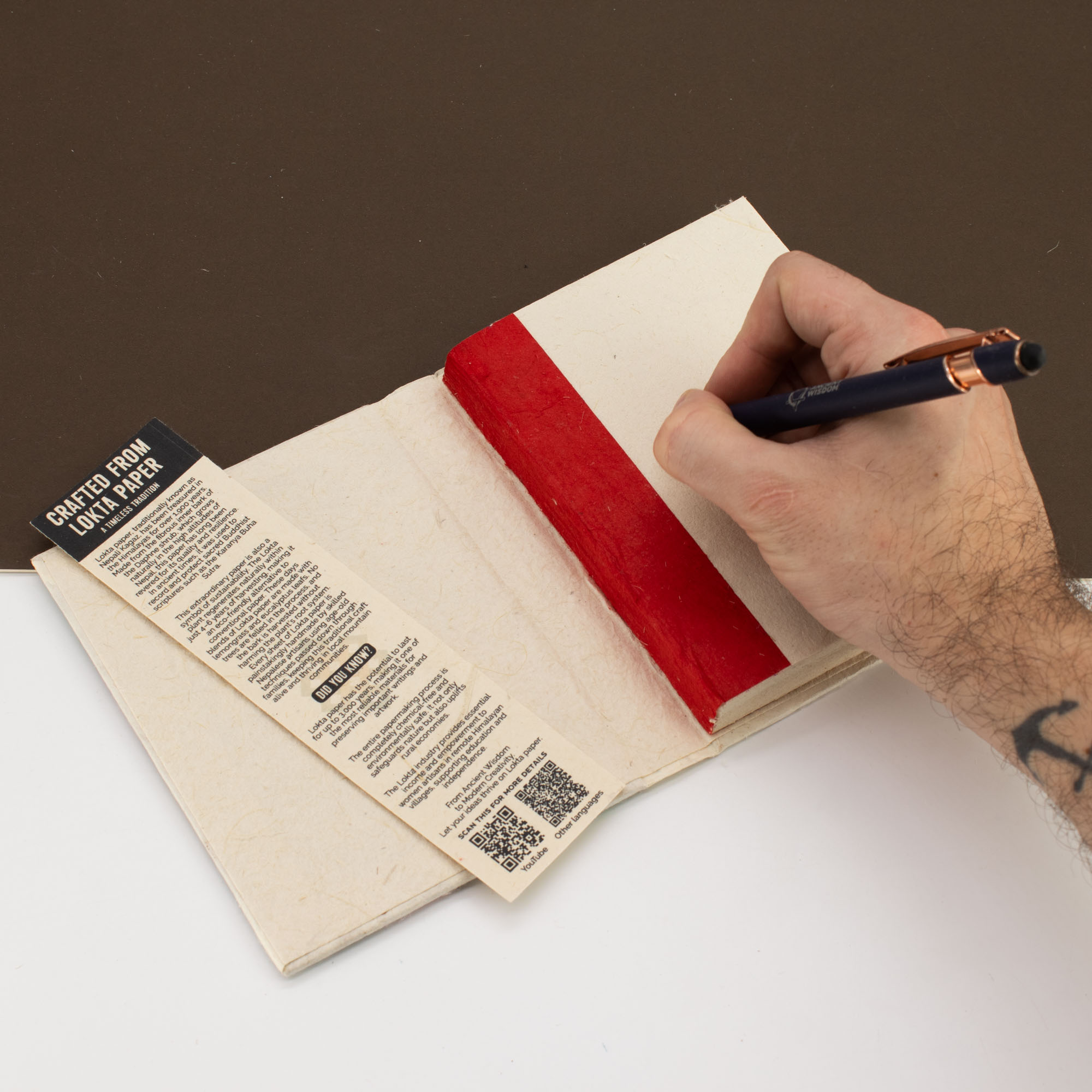 Binnenin bevinden zich 45 handgemaakte pagina’s van Lokta papier, elk met lichte variaties die verwijzen naar traditionele papierproductie in Nepal. Het papier schrijft prettig en is ook geschikt voor lichte schetsen, wat uitnodigt tot regelmatig gebruik.
