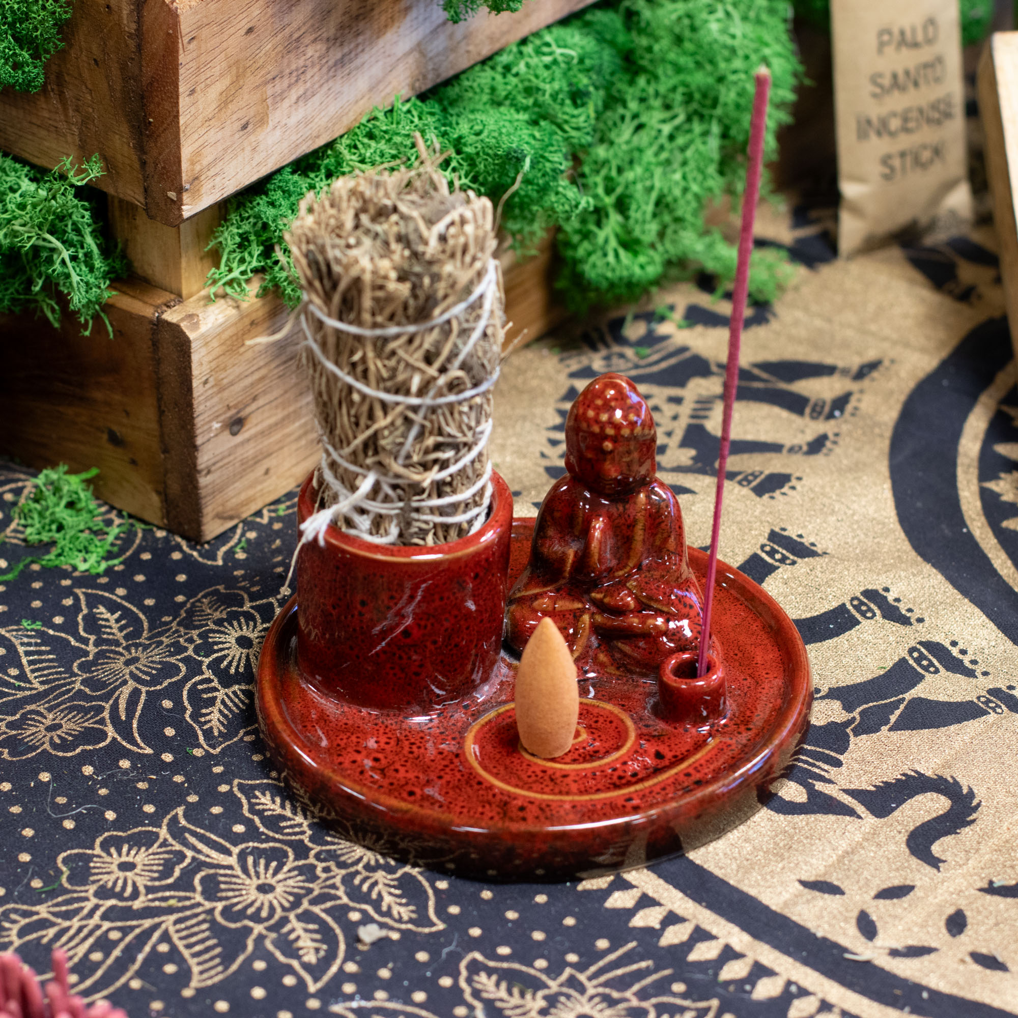 Het ontwerp toont een zittende Boeddha op een ronde plaat met geïntegreerde houders voor wierookstokjes en kegeltjes. Het zachtrode glazuur heeft een aardse uitstraling met subtiele variaties, waardoor elk stuk een handgemaakt karakter krijgt waarmee klanten zich vanzelf verbinden. Ontworpen voor dagelijks ritueelgebruik, houdt het vallende as netjes op en functioneert het ook als decoratief middelpunt.