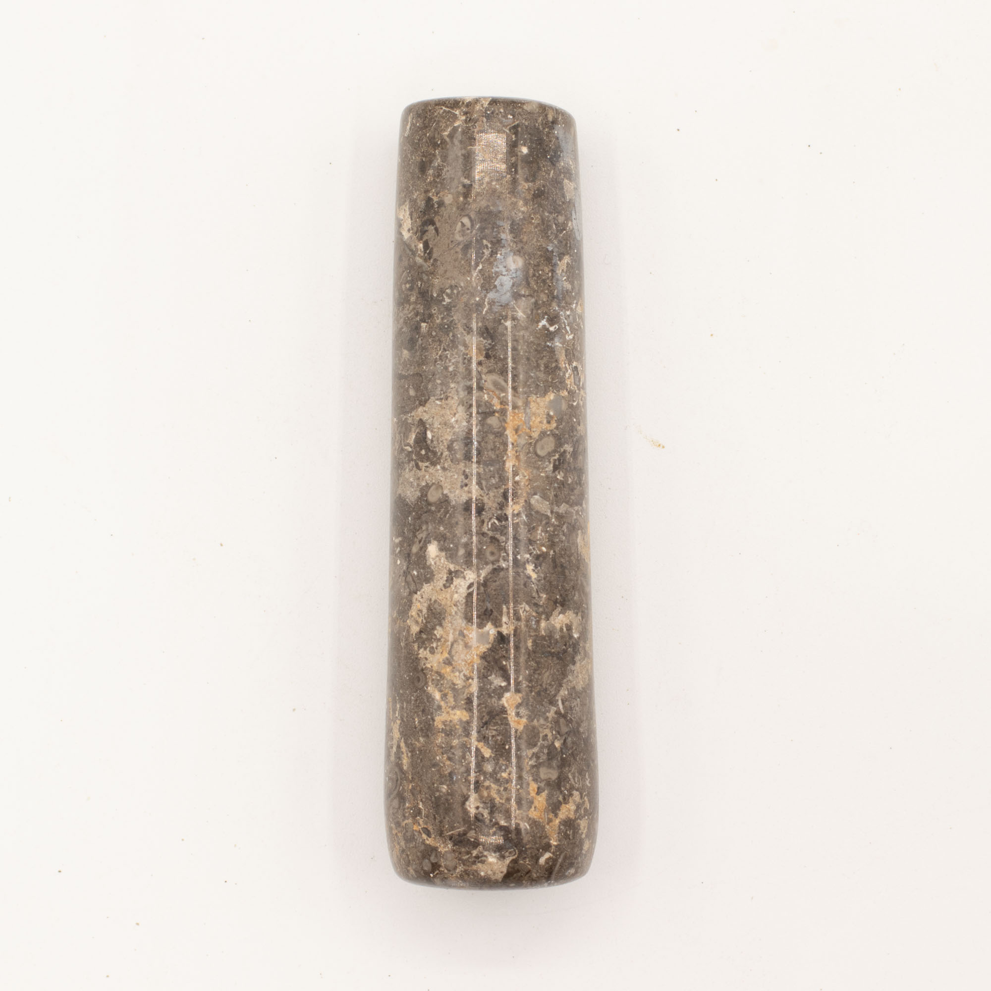Met de hand gesneden uit massieve natuurlijke riviersteen is deze grote stamper en vijzel het meest robuuste stuk in de collectie, met een royale inhoud en een sterke visuele uitstraling. Natuurlijke variaties in kleur, nerf en oppervlak benadrukken het karakter van de steen, waardoor elk exemplaar uniek is.