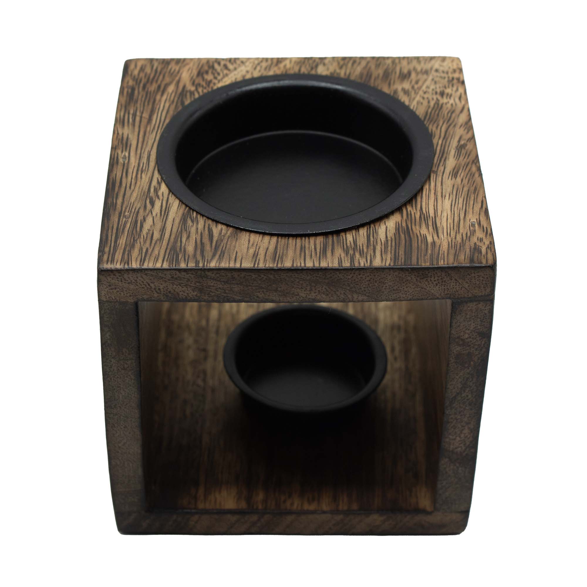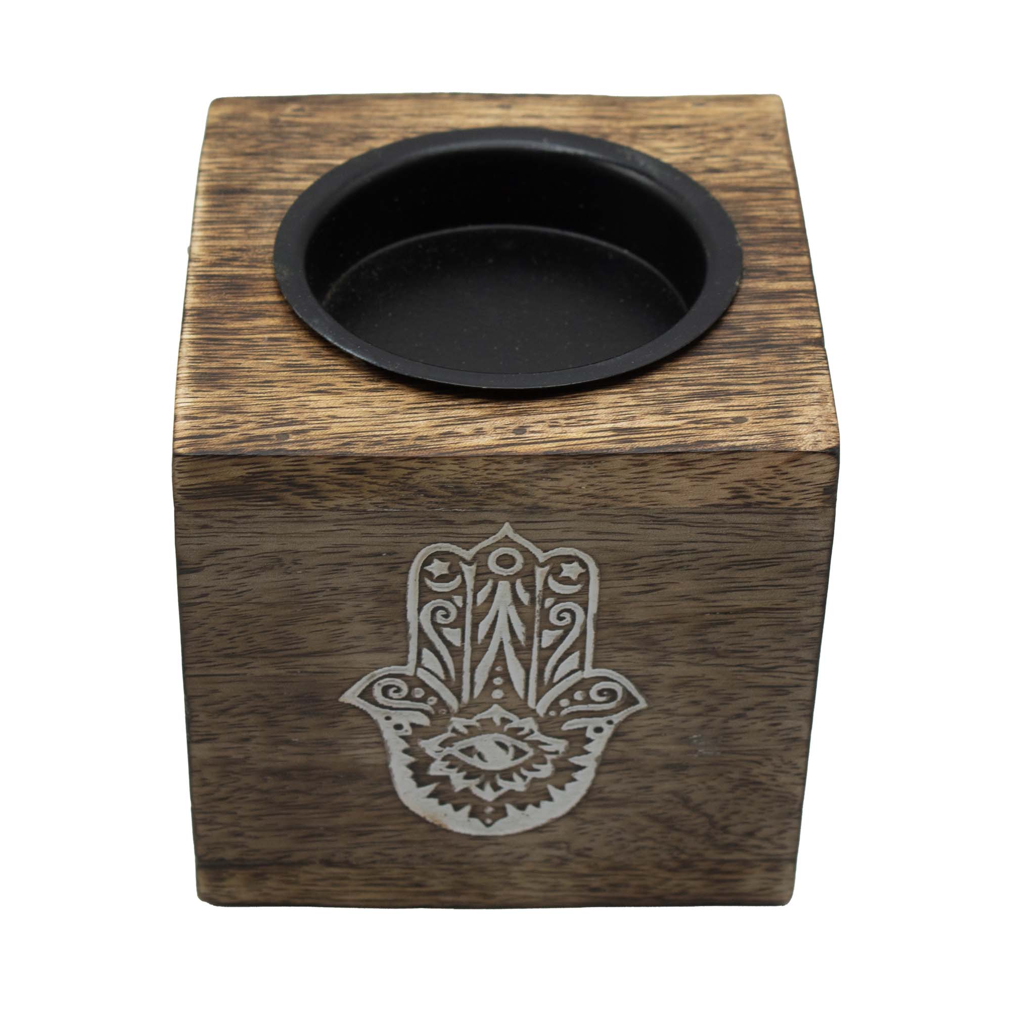 Deze vierkante olieverbrander is versierd met het Hamsa-symbool, traditioneel geassocieerd met bescherming en positieve energie. Gemaakt van mangohout, combineert hij een warme, natuurlijke afwerking met een duidelijk gegraveerd motief.