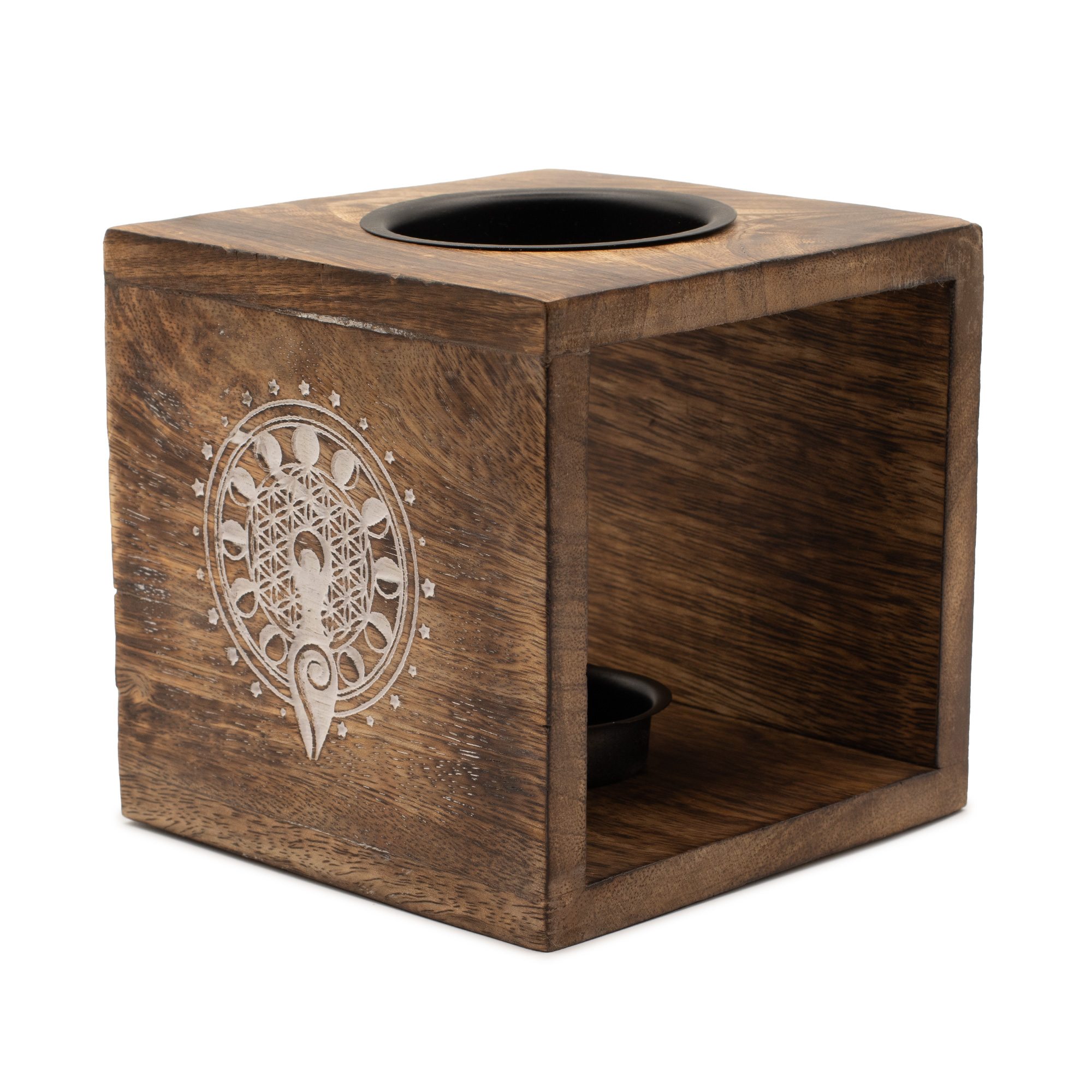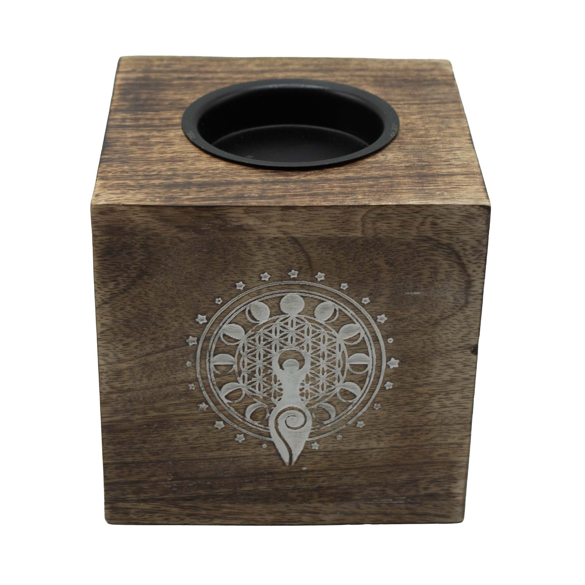 Deze grote vierkante olieverbrander is voorzien van een Maan Godin-design, dat vaak wordt geassocieerd met intuïtie, cycli en vrouwelijke energie. Gemaakt van mangohout, heeft het een warme, natuurlijke afwerking die het gegraveerde ontwerp verzacht en elk stuk een uniek karakter geeft.