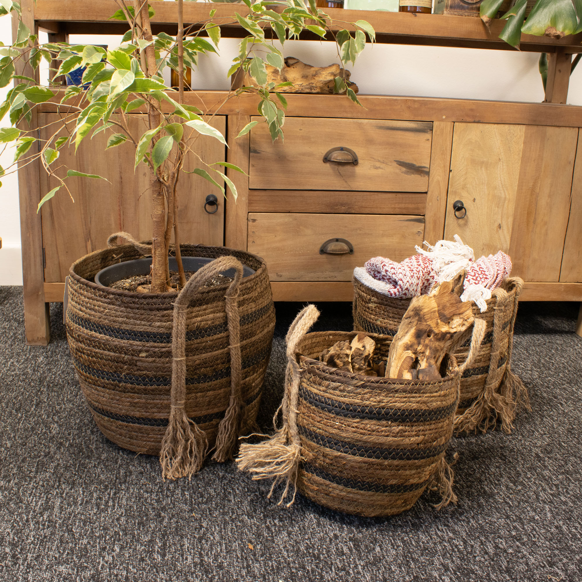 Voor retailers bieden deze manden uitstekende veelzijdigheid voor displays en een sterke visuele aanwezigheid in collecties voor woondecoratie, lifestyle en cadeaus. Ze zijn ideaal voor het presenteren van textiel, opbergaccessoires, seizoensgebonden displays of plantenarrangementen. De geneste set van verschillende maten ondersteunt flexibele winkelpresentaties, terwijl het nestbare ontwerp zorgt voor efficiënte opslag achter de schermen.