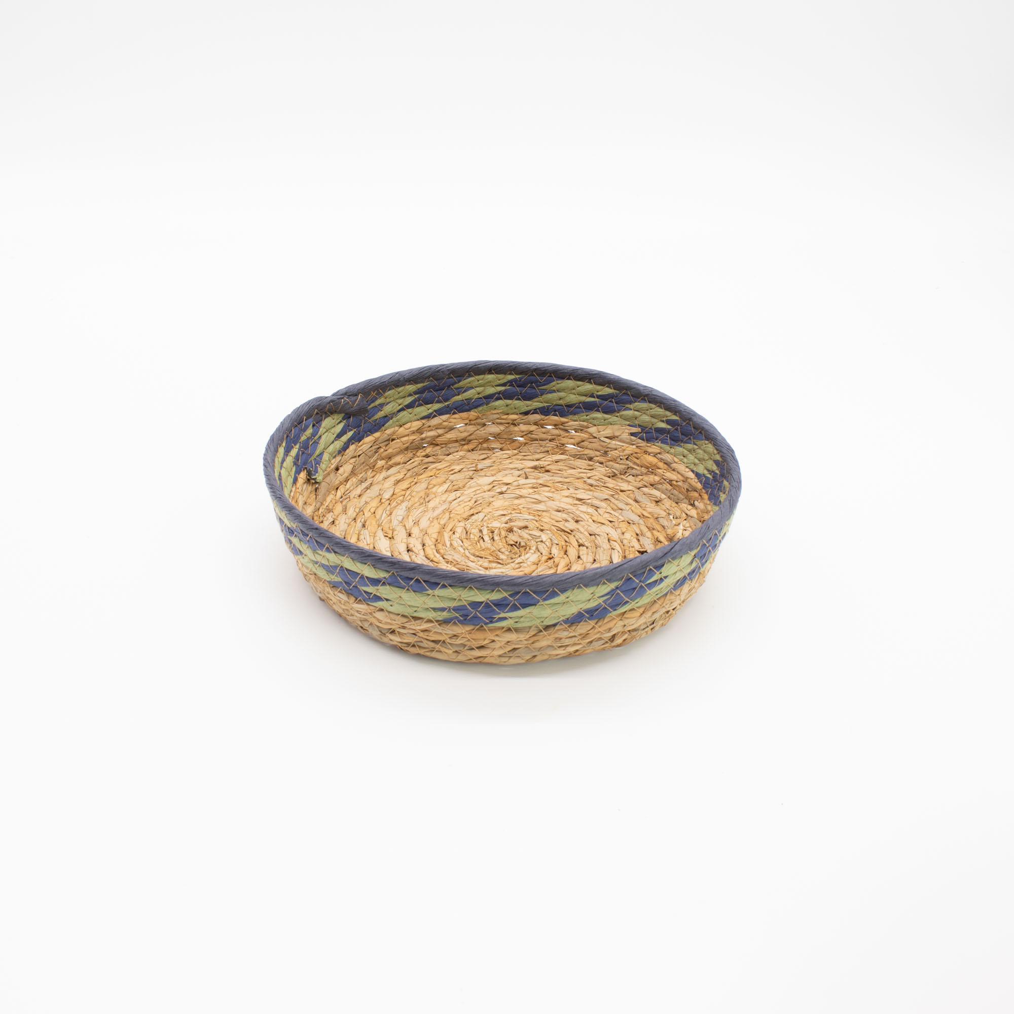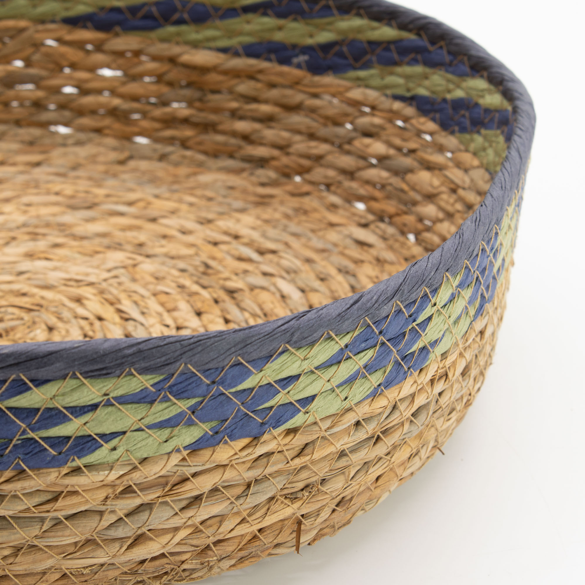 Deze manden zijn met de hand geweven van strak opgerold stro en zeegras, een traditionele techniek die een stevige, gestructureerde basis creëert en tegelijk de natuurlijke flexibiliteit van het materiaal behoudt. Het geweven ontwerp benadrukt subtiele kleurvariaties in de vezels, terwijl de blauwe en groene randaccenten een zacht kleurdetail toevoegen dat het handgemaakte karakter van elk stuk versterkt.