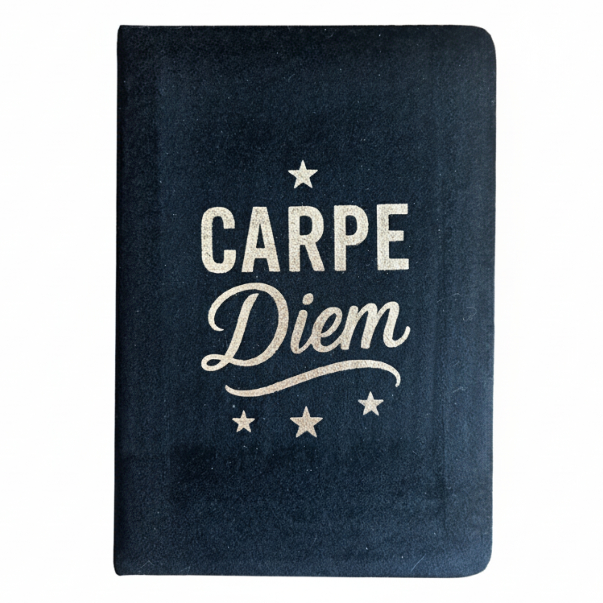 Voeg Doel en Stijl Toe aan je Schrijfwaren met het Carpe Diem Velvet Notebook. Breng een gevoel van inspiratie en elegantie in je assortiment met het Carpe Diem Velvet Notebook in stijlvol zwart. De zachte fluwelen kaft, geperst met de motiverende boodschap Carpe Diem, maakt het een opvallende keuze voor klanten die zowel design als betekenis waarderen.