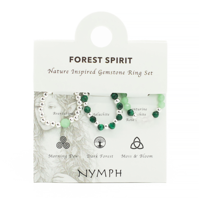 Binnen de set heeft elke ring een eigen naam en symbolische betekenis, waaronder Ochtenddauw, Donker Woud en Mos & Bloei. Deze subtiele details voegen karakter en verhalende diepgang toe en geven de set een zorgvuldig samengestelde uitstraling die uitstekend werkt op het verkooppunt.