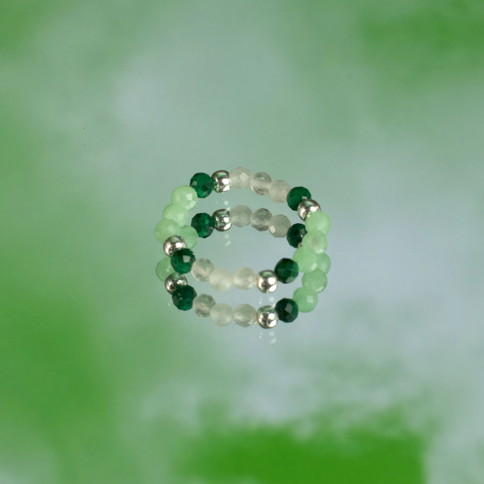 Elke edelsteen brengt zijn eigen karakter mee. Malachiet voegt diepte en natuurlijke tekening toe, Rozenkwarts introduceert warmte en zachtheid, terwijl Aventurijn de set in balans brengt met een lichte, aardse energie. De ringen kunnen samen gestapeld gedragen worden voor een organisch, gelaagd effect of afzonderlijk voor een strakkere, minimalistische stijl.