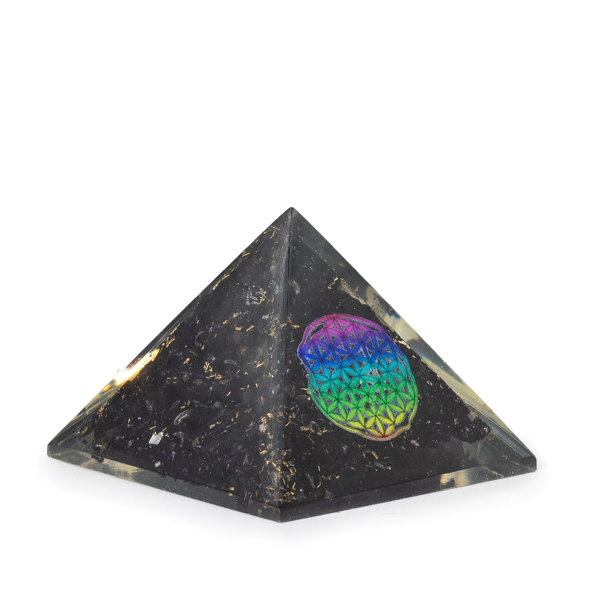 Voeg een betekenisvol en opvallend stuk toe aan je kristal- en wellnessassortiment met de Kleine Orgoniet Piramide – Flower of Life met Zwarte Toermalijn Chips. Elke piramide is met de hand vervaardigd uit hars, metaalsnippers en echte edelstenen, en bevat het heilige Flower of Life-symbool gecombineerd met zwarte toermalijn-chips, bekend om hun aardende werking en bescherming tegen negatieve energie.