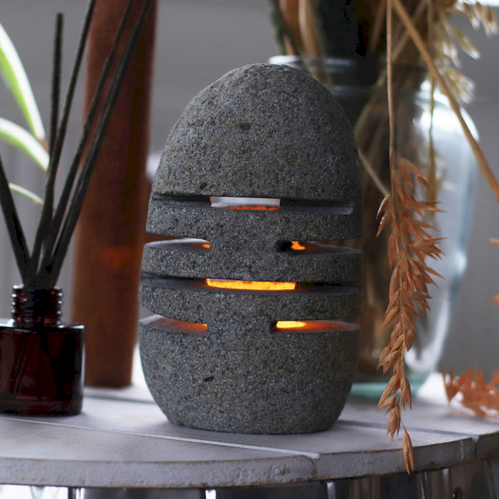 Ontworpen voor een standaard theelichtje, zorgt deze houder voor een rustige, aardende sfeer die geschikt is voor uiteenlopende winkelomgevingen. Het geslepen ontwerp van de staande steen voegt subtiele visuele interesse toe en is eenvoudig te combineren met hout, keramiek, textiel en andere natuurlijke materialen.