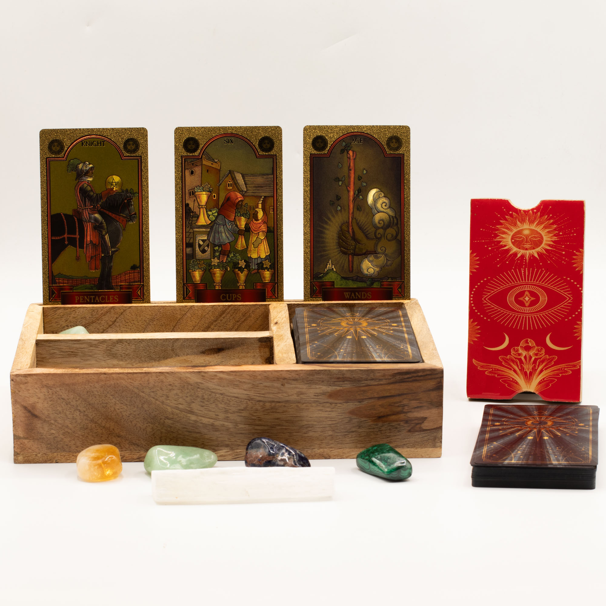 Ontworpen voor uitgebreidere readings, biedt deze mangohouten tarotdoos drie interne secties om een meer gelaagde aanpak van kaartopslag en gebruik te ondersteunen. De verdeelde indeling zorgt ervoor dat decks, spreads of referentiekaarten netjes georganiseerd blijven, terwijl de geïntegreerde kaarthouder aan de voorkant een duidelijk focuspunt biedt voor een gekozen kaart tijdens readings of in-store displays.