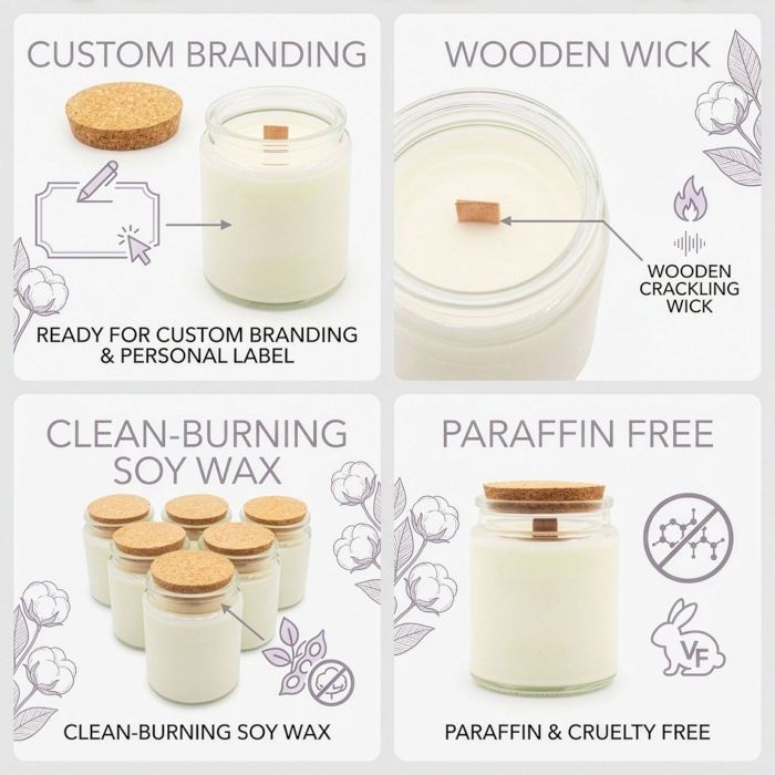 Voeg een frisse en schone geur toe aan je huisgeurassortiment met de Leaves and Linen Sojakaars met Houten Lont. Ontwikkeld voor bedrijven die hun eigen merkcollecties opbouwen, wordt deze kaars geleverd in een ongeëtiketteerd, klaar-om-aan-te-passen formaat, wat een eenvoudige oplossing biedt voor retailers die hun eigen kaarsenlijn willen introduceren. De combinatie van een heldere glazen pot en een natuurlijke kurkdeksel zorgt voor een neutrale, moderne uitstraling die moeiteloos aansluit bij verschillende merkstijlen.