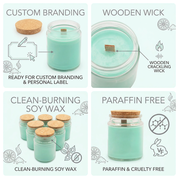 Breng de frisheid van de natuur in je geurcollectie met de Moss & Mist Sojakaars met Houten Lont. Ontworpen voor retailers die hun eigen merkcollecties van kaarsen creëren, wordt deze kaars geleverd in een ongeëtiketteerd, klaar-voor-branding formaat, waardoor bedrijven het product eenvoudig kunnen personaliseren met hun eigen labels en verpakking. De heldere glazen pot met natuurlijke kurkdeksel zorgt voor een strakke en minimalistische uitstraling die moeiteloos past bij verschillende retailstijlen.