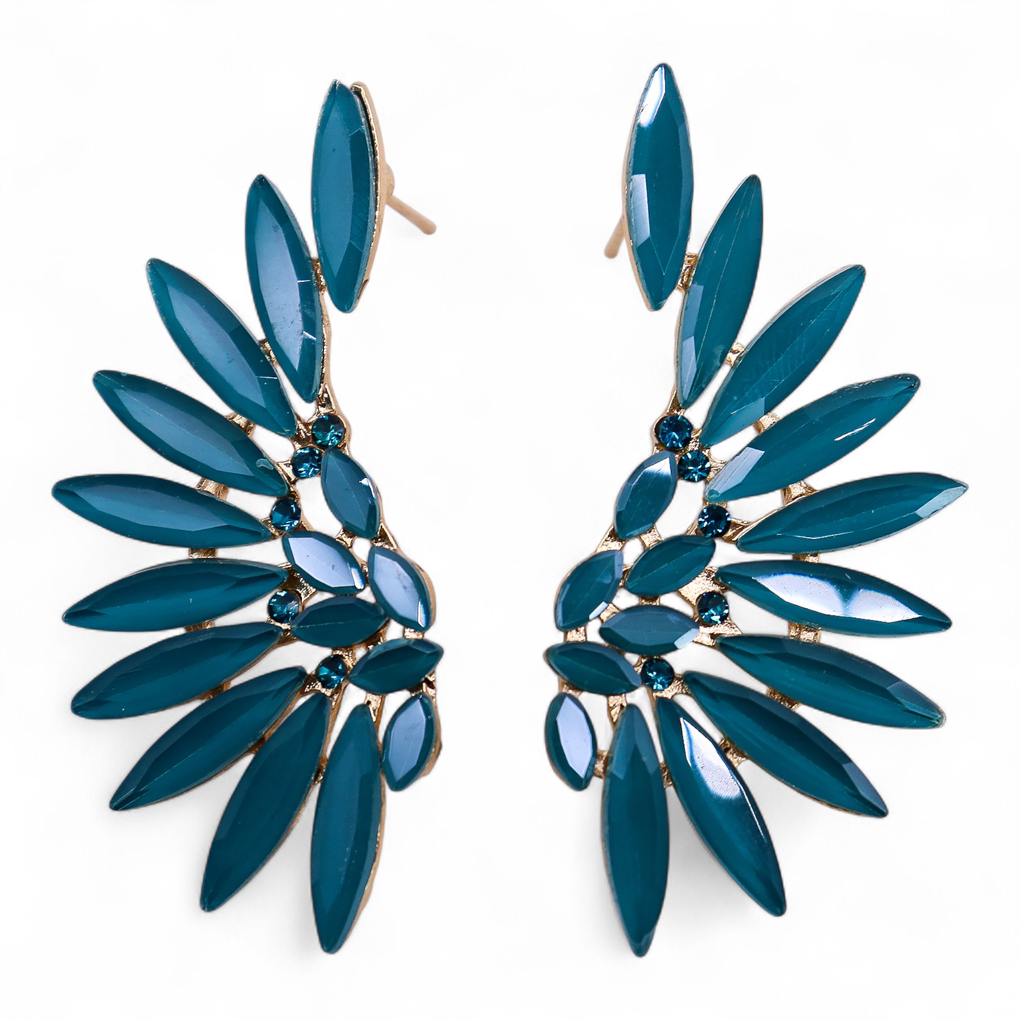 Deze Angel Wings oorbellen tonen diep teal-groene glaselementen die het licht vangen als opspattend zeeschuim. Het gevleugelde ontwerp symboliseert beweging en vrijheid en biedt een opvallend, maar draagbaar sieraad. Ideaal voor retailers die op zoek zijn naar elegante, kleurrijke juwelen die symboliek en stijl combineren.