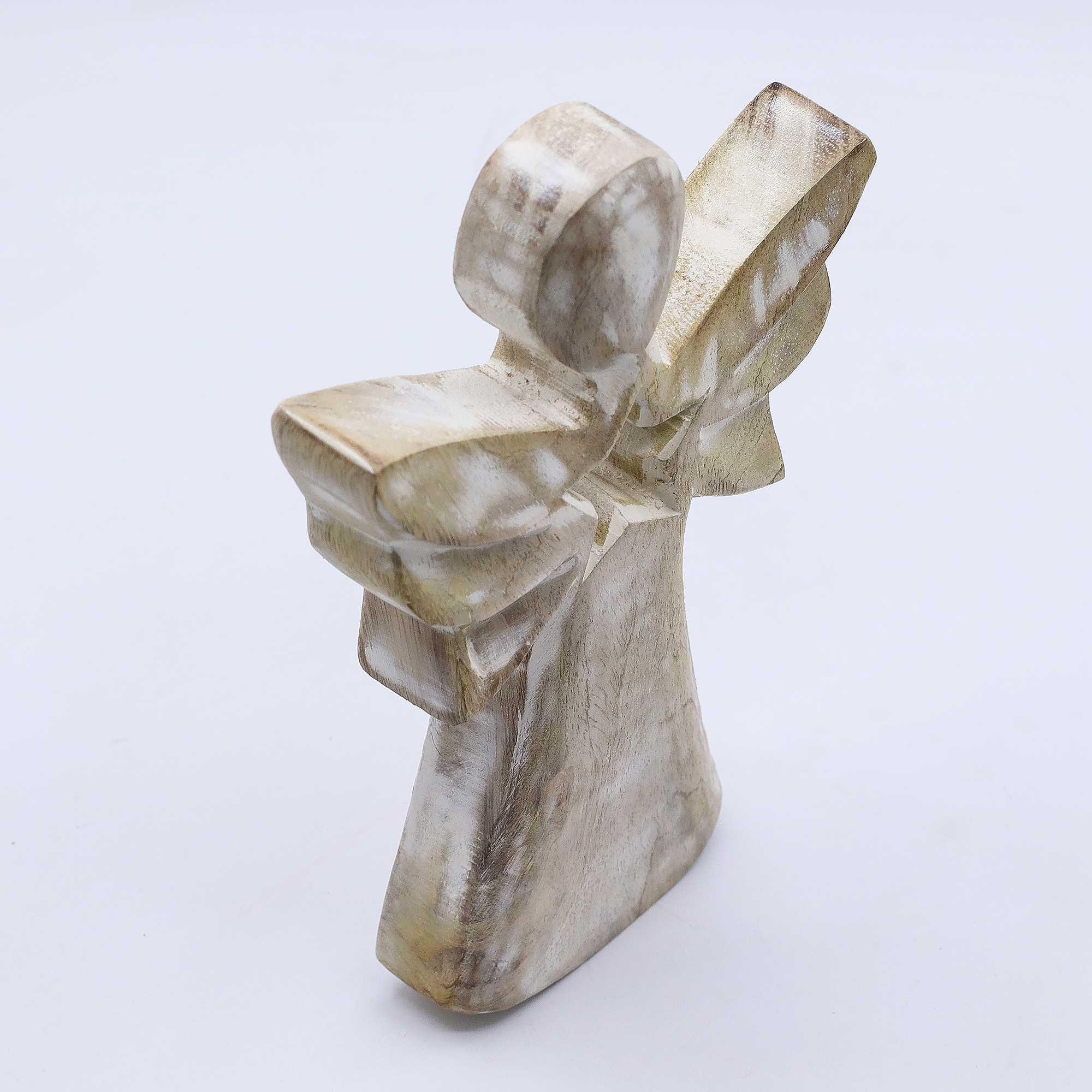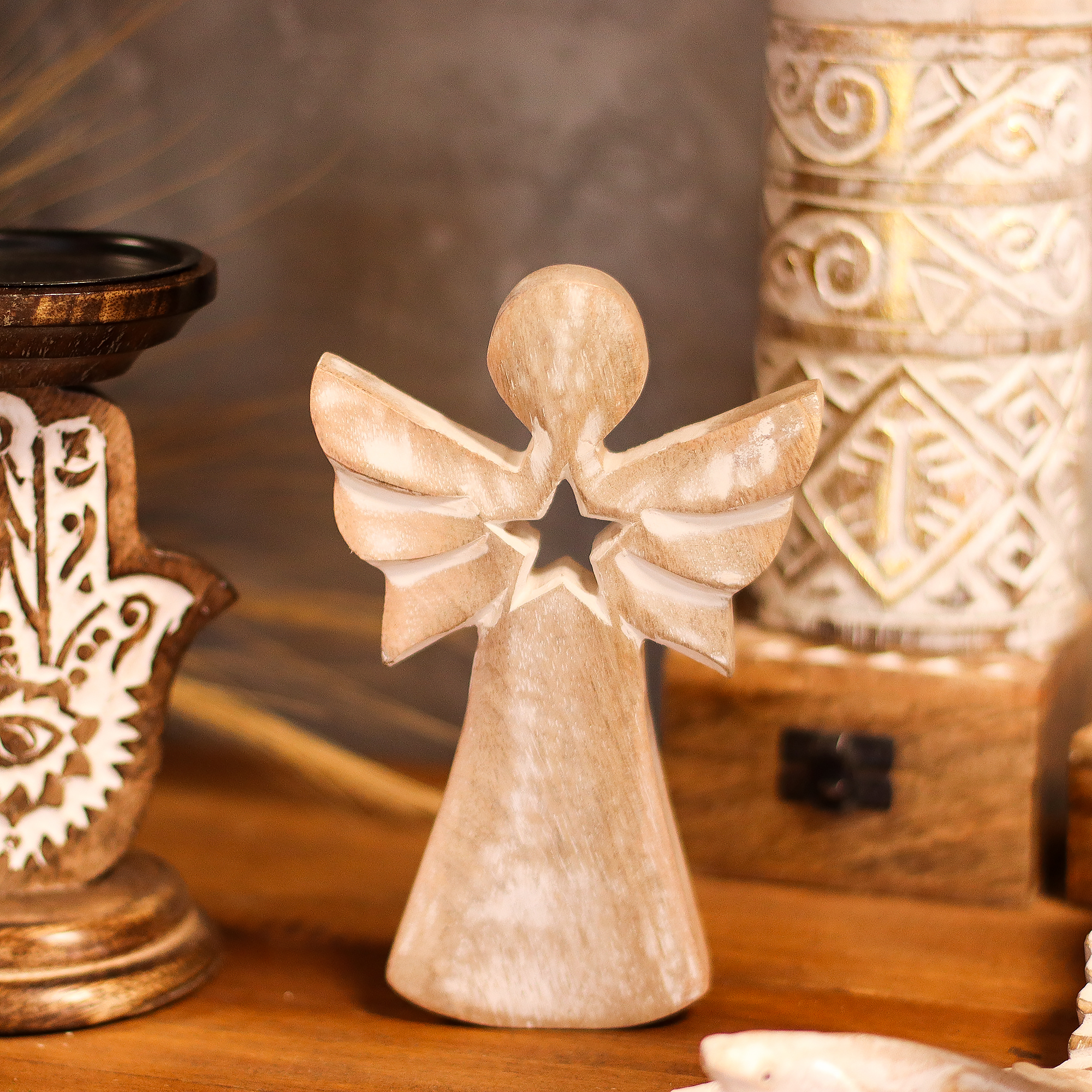 Deze aantrekkelijke 18 cm Mango Houten Engel – Whitewash met Ster Uitsnede combineert rustieke charme met een hemelse uitstraling. Met de hand gesneden in India uit duurzaam mangohout, is dit stuk afgewerkt met een zachte whitewash en voorzien van een charmante stervormige uitsnede. Elk exemplaar is fair trade geproduceerd en individueel vervaardigd. Deze veelzijdige engel is een sfeervol decoratief accent, een betekenisvol geschenk of een geliefd artikel voor kerstpresentaties.