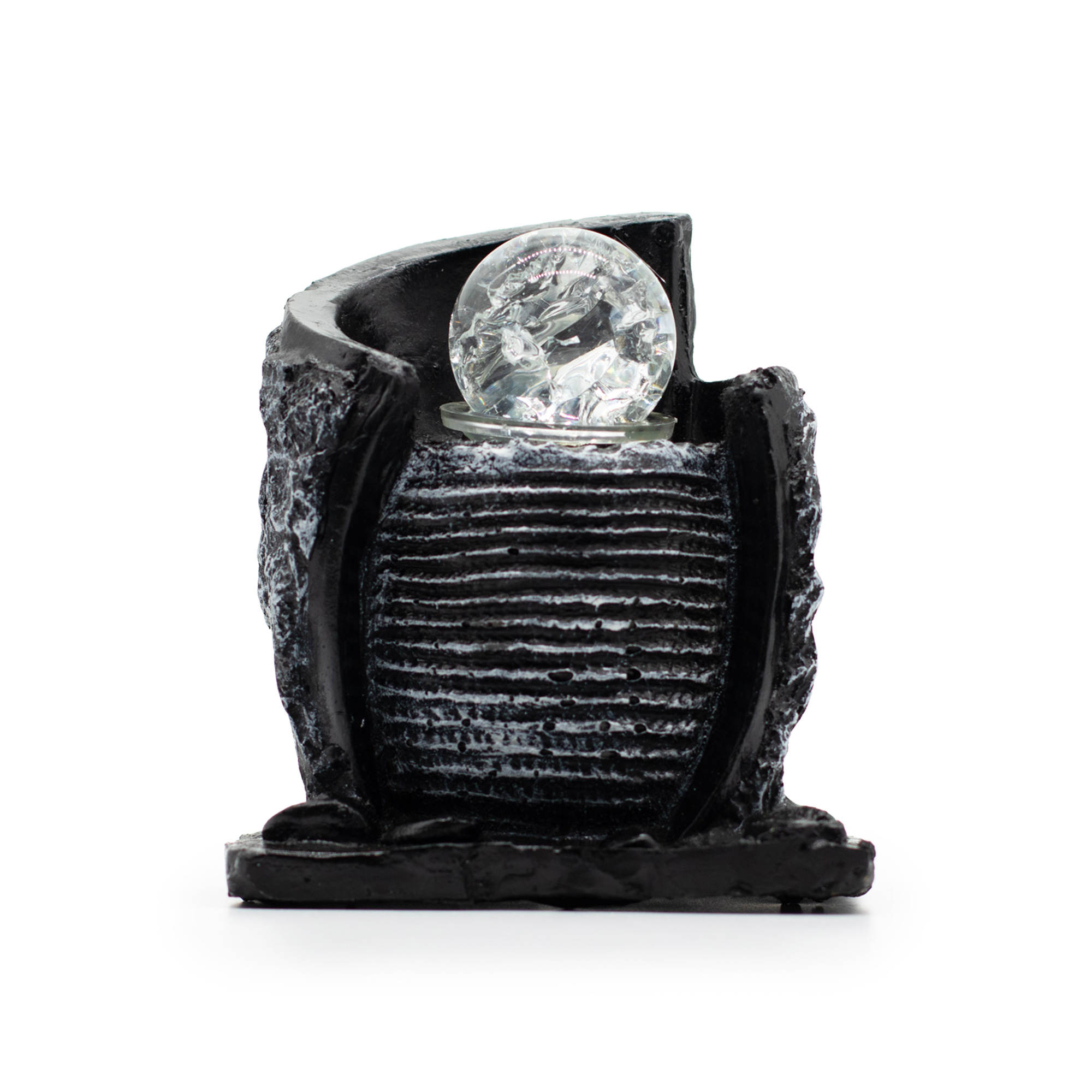 Breng een gevoel van rust in elke ruimte met dit Tafelwaterornament – Waterpot & Kristallen Bol. Gemaakt met een steen-effect afwerking, is de geribbelde waterpot geplaatst binnen getextureerde rotsvormen en afgewerkt in diepe antraciettinten voor een moderne, door zen geïnspireerde uitstraling.
